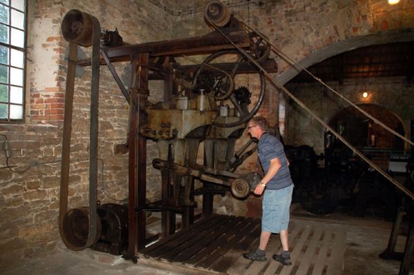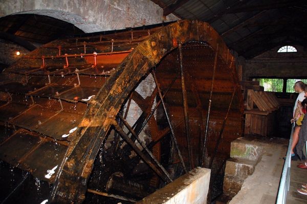 Potężne drewniane koło o średnicy 8 metrów, największe zachowane i nadal działające przy specjalnych okazjach w Europie, powoli rusza pod naporem skierowanego na nie strumienia wody.
