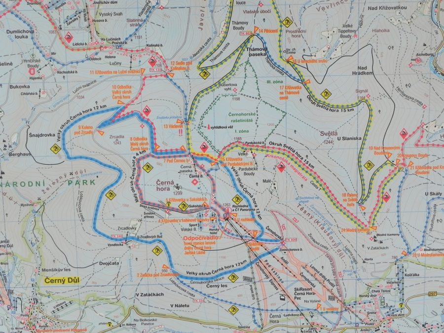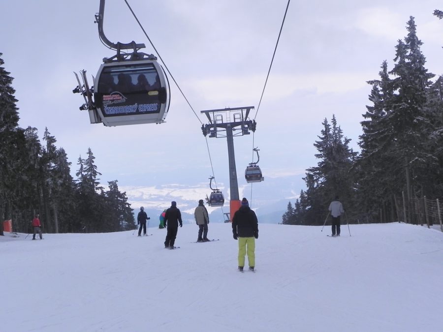 Najważniejszą osią ośrodka Černá hora jest ośmioosobowa kolejka gondolowa ? Černohorský Express. W ciągu ośmiu minut pokonuje ona 2300 metrów i 560 m różnicy poziomów. W dół prowadzi kilka tras, w sumie naliczono tu ich 17,5 kilometra. Najdłuższy zjazd, jaki możemy skomponować ma blisko trzy kilometry. Całość ? oprócz gondolki ? obsługują jeszcze dwa wyciągi krzesełkowe. Dłuższy jest Protěž: czteroosobowa ławka ma 1,3 km i obsługuje najdłuższą (1,6 km) oświetloną nartostradę w Czechach ? tu można przyjść na nocne jazdy. Ale uwaga, nawet posiadacze wielodniowych karnetów za tę przyjemność zapłacą dodatkowo.