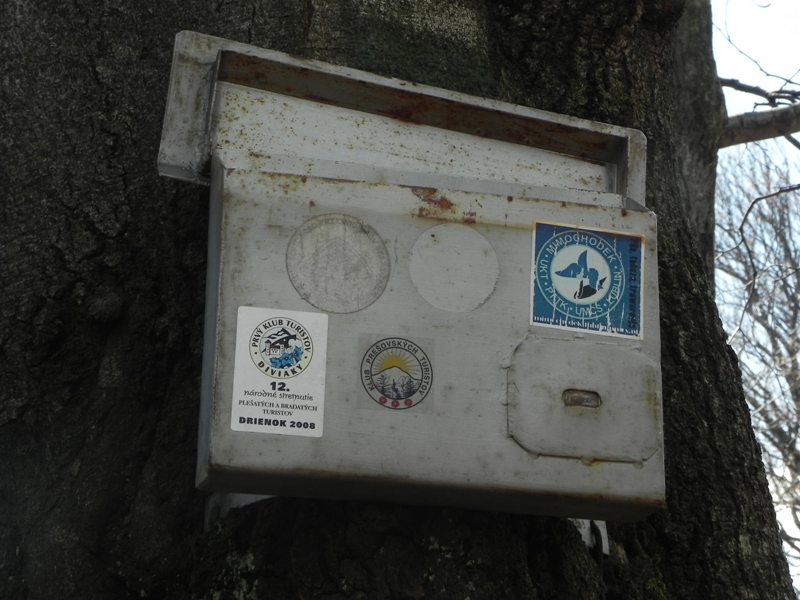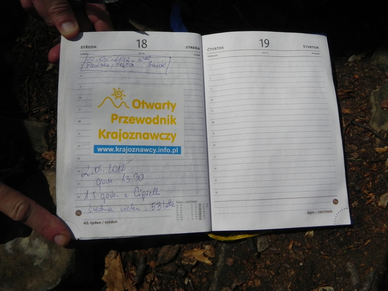 Z górą, odpoczywając, zmagaliśmy się półtorej godziny. Szybciej niż sugerował drogowskaz. Termometr na szczycie wskazywał 25 stopni. Był, wisiał na drzewie ponad skrzynką na księgę pamiątkową; wpisaliśmy się, a jakże. Na szczycie stoi krzyż, drogowskazy, tablica informacyjna. Wyczytałam, że na tej górze, najwyższej w okolicy, mieszkły kiedyś olbrzymy? i że czarownice spotykały się tu ze swym mocodawcą Lucyferem? Widoków nie ma, bo wierzchołek zarośnięty. W prześwicie między drzewami na północy, w dolinie, można jednak zobaczyć charakterystyczny schodkowaty kształt sanatorium Biawena w Wysowej.