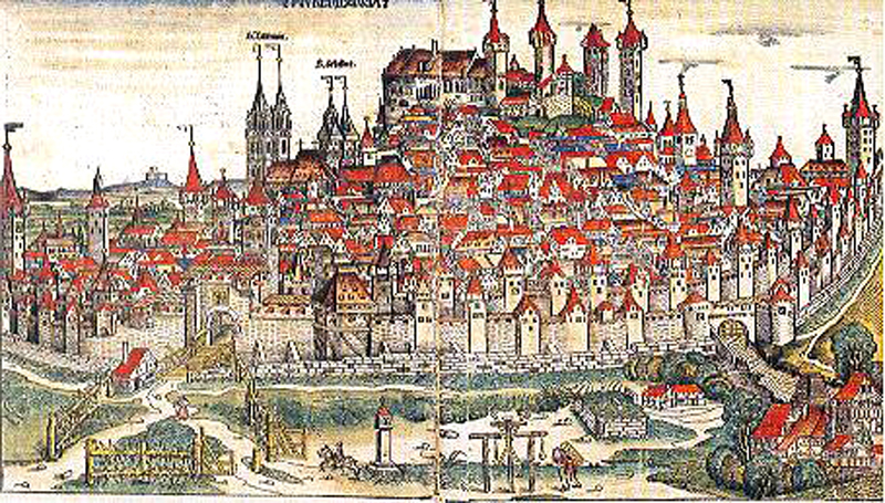 We wczesnym średniowieczu w jej okolicach przebiegała granica germańsko-słowiańska. Zaś miasto rozwinęło się u podnóża zamku dzięki uzyskiwanym przywilejom handlowym. Już w XII w. zostało stolicą burgrabstwa, zaś w 1219 r. wolnym miastem Rzeszy. W XIII-XIV w. prowadziły do niego ?wszystkie drogi? w tej części Europy, gdyż obok Augsburga było jednym z dwu największych centrów handlowych między północną częścią kontynentu i Rzymem. A zarazem jednym z największych miast Europy środkowej.