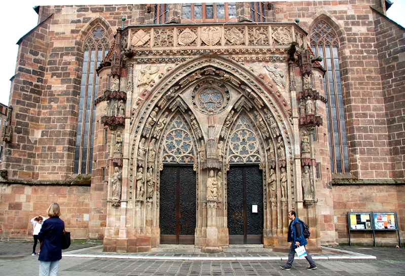 Tak wygląda Norymberga (Nürnberg) na jej ręcznie kolorowanej panoramie ? drzeworycie z pracowni Michaela Wolgemuta. Zamieszczono go w jednej z najsłynniejszych ksiąg końca XV wieku napisanej przez Hartmanna Schedla, ?Liber Chronicarum? czyli ?Kronika świata?. Wydrukowana została w tym mieście w roku 1493 w wersji łacińskiej i niemieckiej. Znalazło się w niej około 100 widoków miast, w tym także polskich lub należących obecnie do Polski. Ponad półmilionowa obecnie Norymberga, zniszczona w okresie II wojny światowej niemal tak gruntownie jak Warszawa, wygląda oczywiście obecnie inaczej. Ale jej Stare Miasto nadal otoczone średniowiecznymi murami, których pozostało blisko 4 km, z potrójnym zamkiem na północnym krańcu, zachowało dawny układ architektoniczny. Ocalało też trochę zabytkowych budowli, a wśród nich trzy wspaniałe gotyckie kościoły.