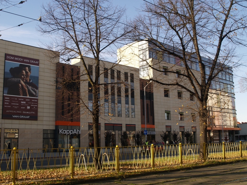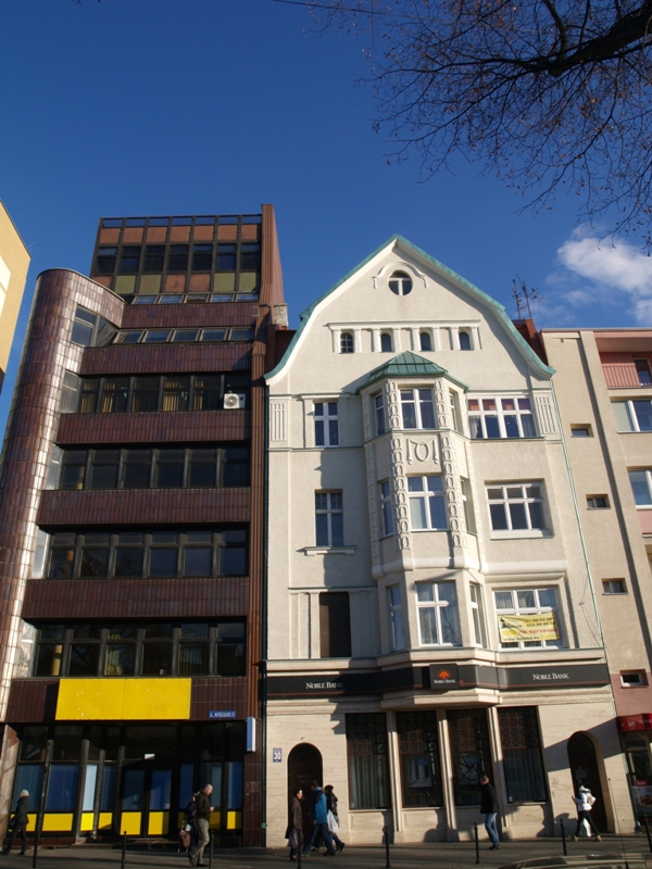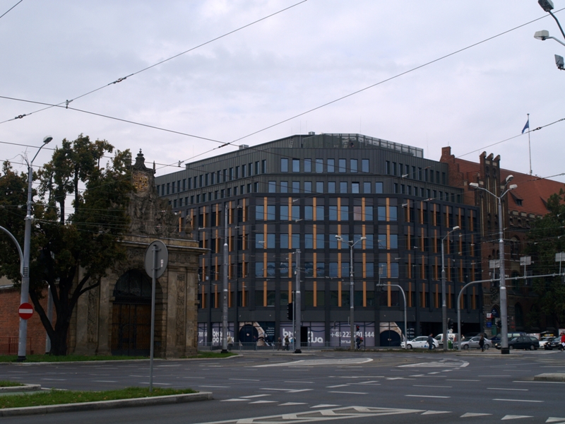 Ten, przylepiony do gmachu poczty (wybudowanego w 1905 r. dla Pruskiej Poczty Królewskiej) w stylu ceglanego neogotyku typowego dla architektury Szczecina i Pomorza Zachodniego, jest tej samej wysokości i ma szczyt schodkowy odsłaniający szczyt spadzistego dachu poczty. Pomarańczowe wstawki dobrze się komponują z kolorem sąsiada. Przeciwna strona Alei jest zupełnie inna. Biurowiec w kształcie trapezu stoi solo, bo za nim jest blok mieszkalny i handel od strony szczytu. Powojenna zabudowa w tym rejonie, w nadodrzańskim centrum miasta, zmiecionym z powierzchni ziemi, była chaotyczna. Pomiędzy tym, co ocalało lub oparło się rozbiórce, budowano mieszkalne deski różnej wysokości. Taka była potrzeba czasu i – choć przewidziane na jedno pokolenie – trwać będą jeszcze długo.