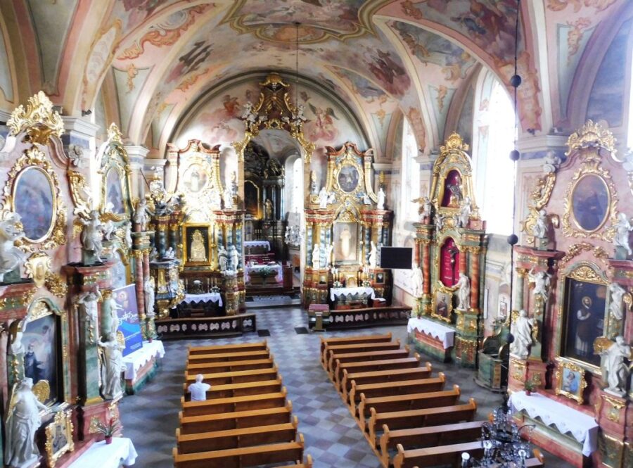 Kościół jest budowlą z jedną nawą i bez wieży. Późnorenesansowa bryła kościoła ma jeszcze wiele cech gotyckich, nie ma ozdób. Prezbiterium i nawa przykryte są sklepieniem kolebkowym z lunetami. XVIII-wieczne ołtarze główny i dwa boczne przetrwały do dziś. W jednym z nich jest obraz św. Antoniego Padewskiego namalowany w roku 1658 przez Stefana Ratajskiego. Przebudowano wtedy organy, założono nową posadzkę i w roku 1764 rozpoczęto prace związane z pokryciem kościoła polichromią wykonaną przez znanego artystę, bernardyna Walentego Żebrowskiego. Zmarł on w Kaliszu w 1765 r.