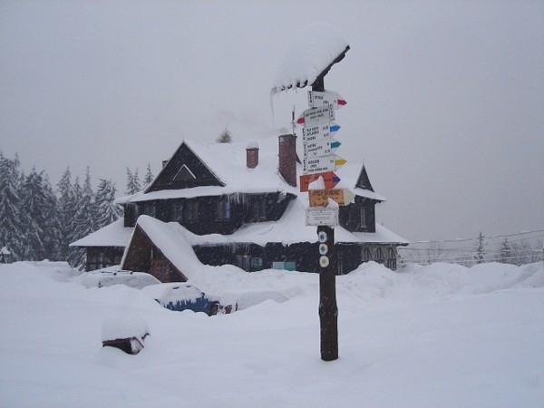 Po takiej uczcie ruszam w kierunku schroniska PTTK na Równicy. I tu się zmieniło. Na drzwiach wita napis „zakaz spożywania własnego prowiantu” – no to leżcie kanapki w plecaku. Zerkam na ceny w menu i oczopląsu dostaję. Swojego nie wolno, a na ich… Przeciętnego turysty nie stać. Chyba, że grzańca – ten jeszcze w przyzwoitej cenie. Za to przewodnik „Szlaki beskidzkie” za jedyne 6 zł! Kiedyś było to fajne schronisko – dziś został… fajny budynek. Już spod schroniska widać ogromny napis zapraszający do „Chaty Zbójnickiej”. No to idę… Chałupa fajna, a ceny… Jasne, że wyższe, bo i wyżej chałupę wybudowali.