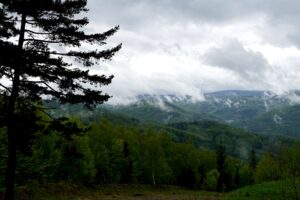 Widoczność prawie zerowa, wszystko pod ciężkimi śniegowymi chmurami. Pozostało mi zwiedzanie przydrożnych karczm. Oj, narosło tego. Ostatni raz szłam tą trasą kilkanaście lat temu. Trudno rozpoznać drogę… Wtedy był tu zakaz wjazdu wszelkich pojazdów, dziś szeroka jezdnia, żeby autokary się dobrze mijały…