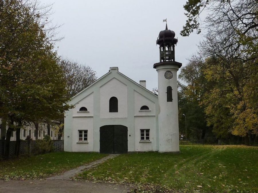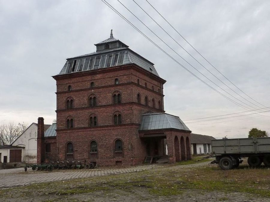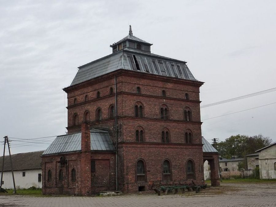 Obok opisanego zespołu pałacowego, powstał zespół folwarczny. Najcenniejszą jego budowlą jest, uznany w roku 2001 za zabytek, murowany z czerwonej cegły spichlerz. Po obu jego stronach znajdują się stodoły. Na całość założenia folwarcznego składają się jeszcze zachowane dwa domy robotników dworskich, gorzelnia z młynem i wielofunkcyjny budynek gospodarczy służący jednocześnie za oborę, chlewnię i stajnię.