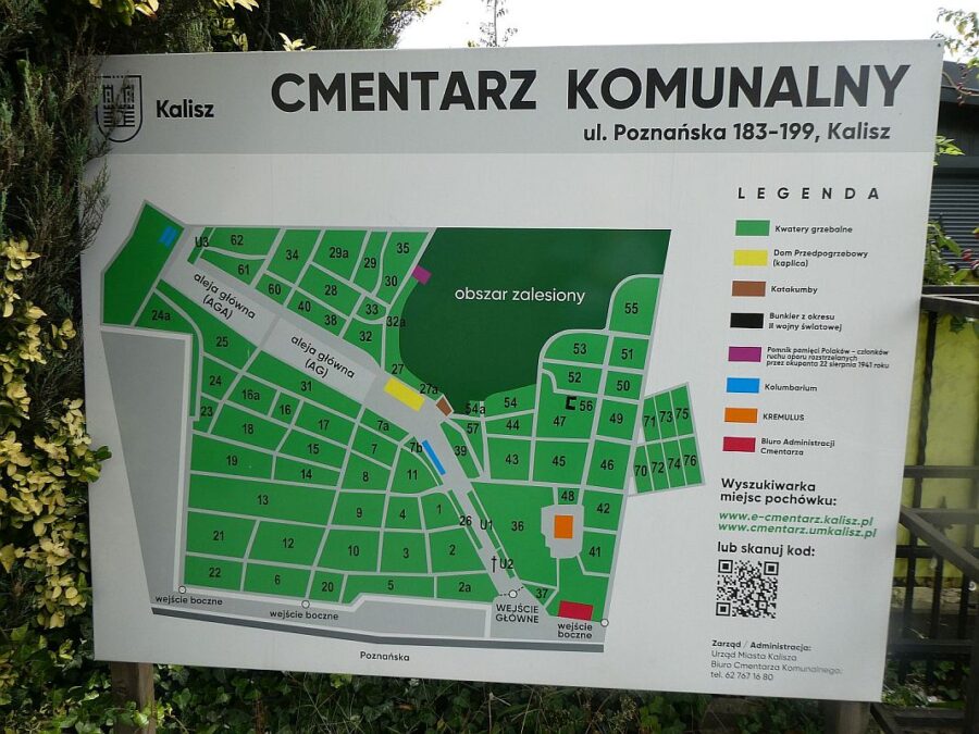 Administracja Cmentarza Komunalnego w Kaliszu na ulicy Poznańskiej również jest administracją cmentarza na Majkowie w Kaliszu przy ulicy Żołnierskiej. Dlatego na swojej stronie podają mapy obu cmentarzy i wyszukiwarkę nagrobków na obu cmentarzach. Wyszukiwarka marnie działa, raczej pokaże nagrobek gdy wpiszesz tylko imię i nazwisko i nic więcej. Na moje uwagi nie odpowiedzieli.