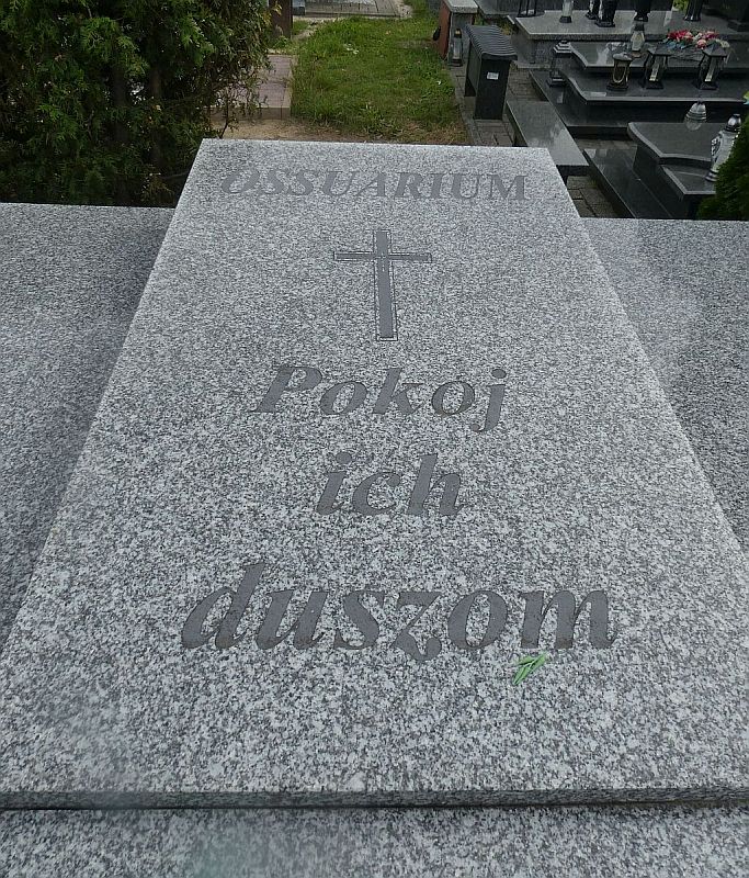 Na terenie cmentarza znajduje się też ossuarium w kształcie prostopadłościanu pokrytego z góry płytami. Na centralnej są napisy „OSSUARIUM”, „Pokój ich duszom” oraz krzyż. Na ścianie frontowej jest dużo płytek zamykających korytarze. Ossuarium (łac. ossuarius, także ossarium) jest to naczynie lub obiekt służący do przechowywania kości albo prochów zmarłego, którego poddano kremacji. Taki obiekt może być przeznaczony na kości z likwidowanych cmentarzy lub rzeczywiście prochy czy popiół z krematorium.