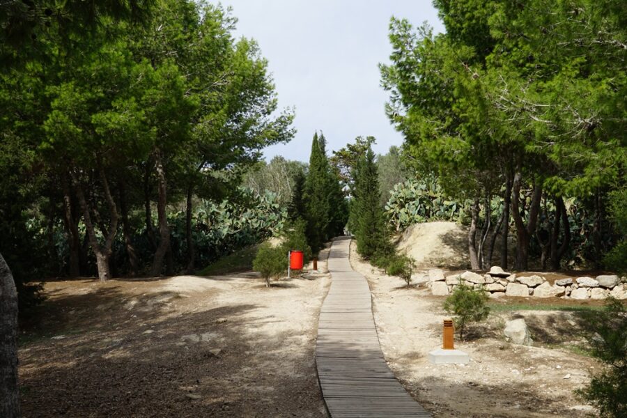 W górę kamienne schody prowadzą do wyłożonej drewnem i otoczonej cyprysami ścieżki, którą dochodzi się do dużej polany z kolejną fontanną. Pierwotnie wzgórze porosłe było garigiem. To formacja roślinna występująca w klimacie śródziemnomorskim, składająca się z zimozielonych, liściastych krzewów lub małych drzewek, głównie kolczastych i aromatycznych. W kolejnych latach zasadzono tu wiele drzew i krzewów.