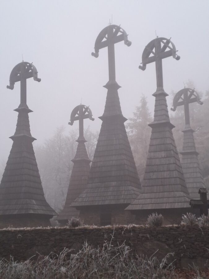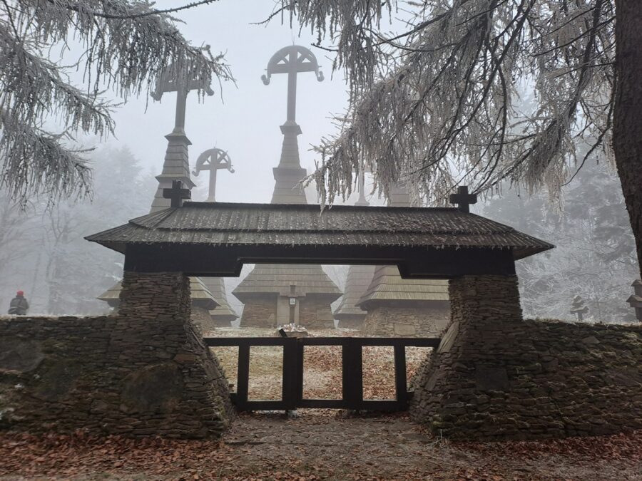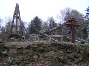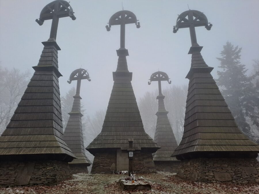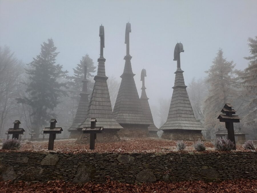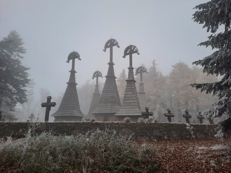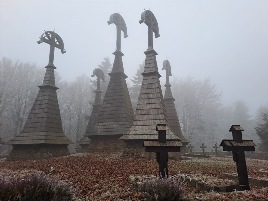 Wieże otaczają imienne nagrobki z drewnianymi krzyżami a całość zamknięta jest kamiennym murkiem z bramką. Teraz cmentarz znajduje się w środku lasu, wtedy jednak gdy powstawał wzgórze było kompletnie bezleśne a wieże widoczne były z daleka. Można to zobaczyć na starych zdjęciach.
