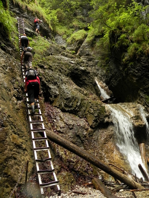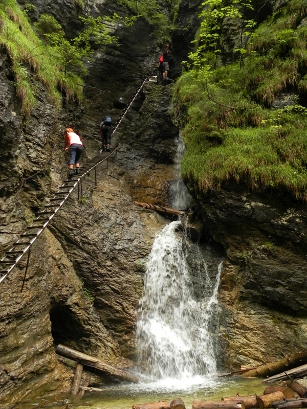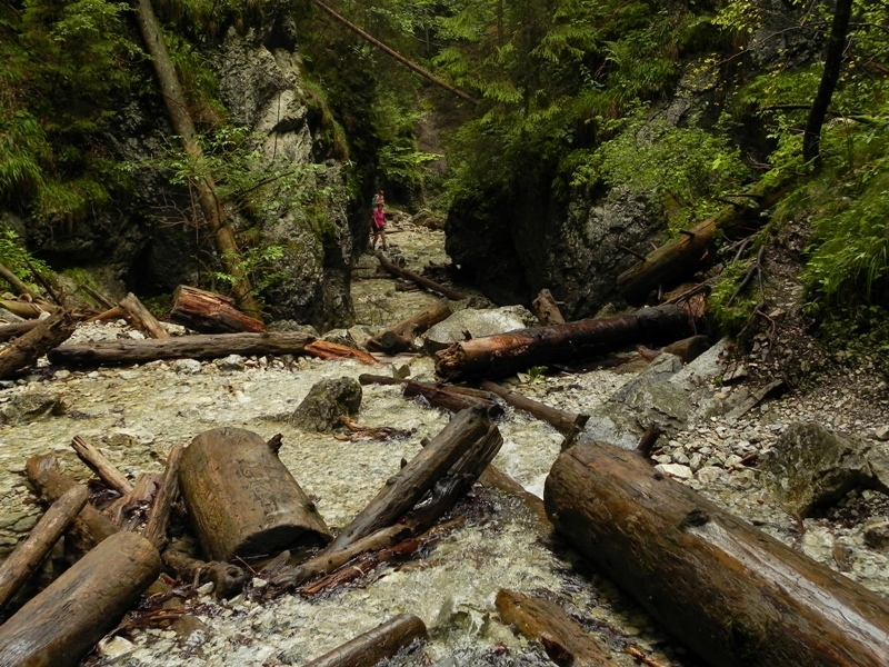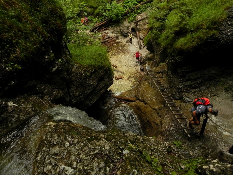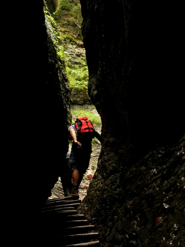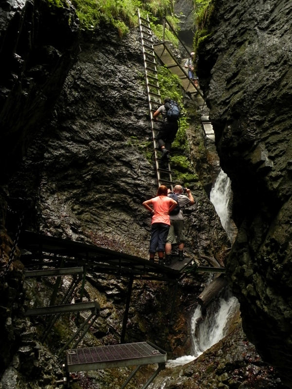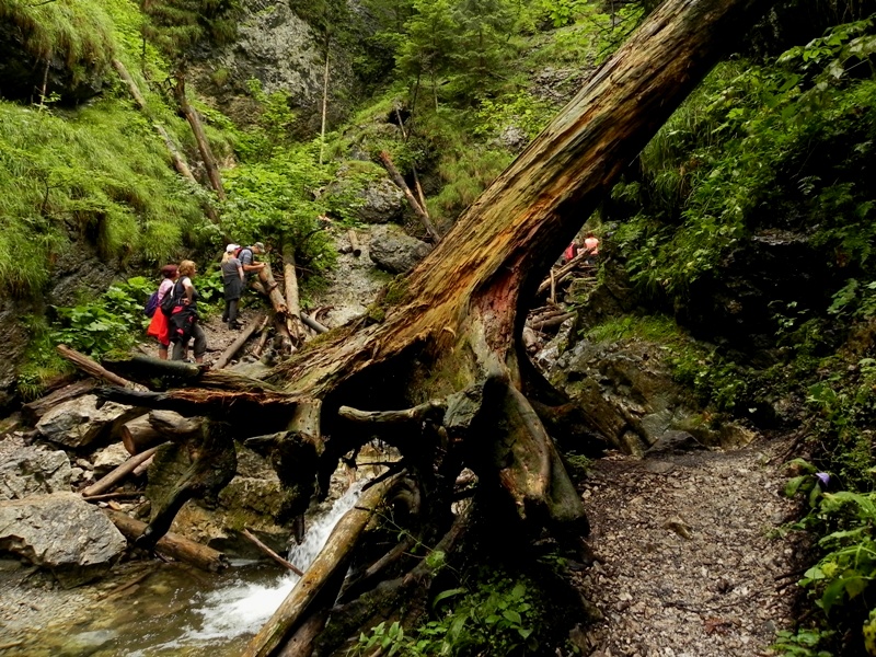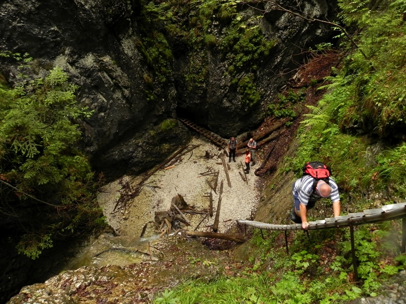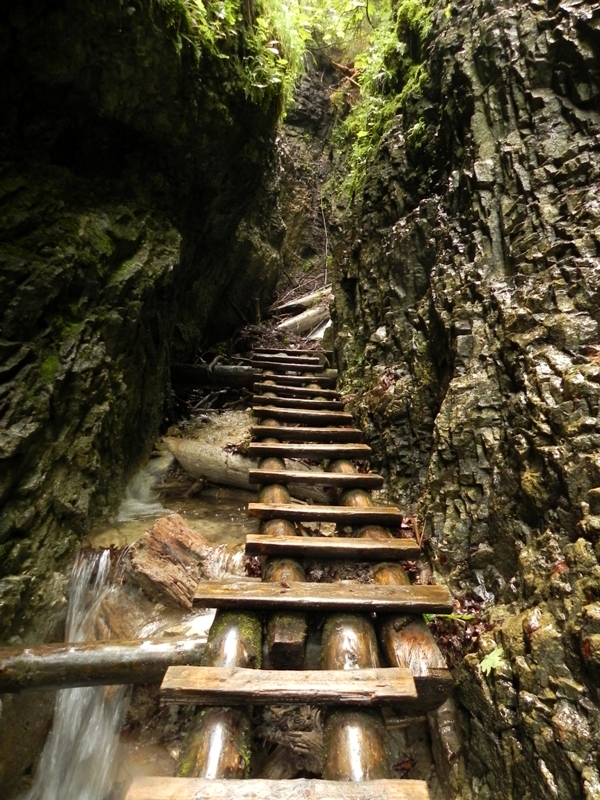 Ciąg drabinek przy wodospadzie Misowym (spadająca woda wyżłobiła tu głębokie niecki) jest pierwszym, ale nie ostatnim wyzwaniem. Dalej już praktycznie na całej trasie korzystamy z drewnianych pomostów, metalowych drabinek, klamer i stopni nazywanych tu ?stupaczkami?. Krótkie odcinki pokonywane po ziemi pozwalają odpocząć nogom i rękom zanim wkroczymy w wąskie, ciemne i mokre zwężenie wąwozu. To miejsce zwane Roklina (jar). Do Okienkowego Wodospadu docieramy znów trzymając się łańcuchów, a po kolejnej serii metalowych drabinek przechodzimy przez skalne okno. Nogi bolą, ręce mdleją. Mogłoby się to już wreszcie skończyć. Ale przez cały czas urzekają widoki… Wreszcie wychodzimy na zwykłą ścieżkę przez las.