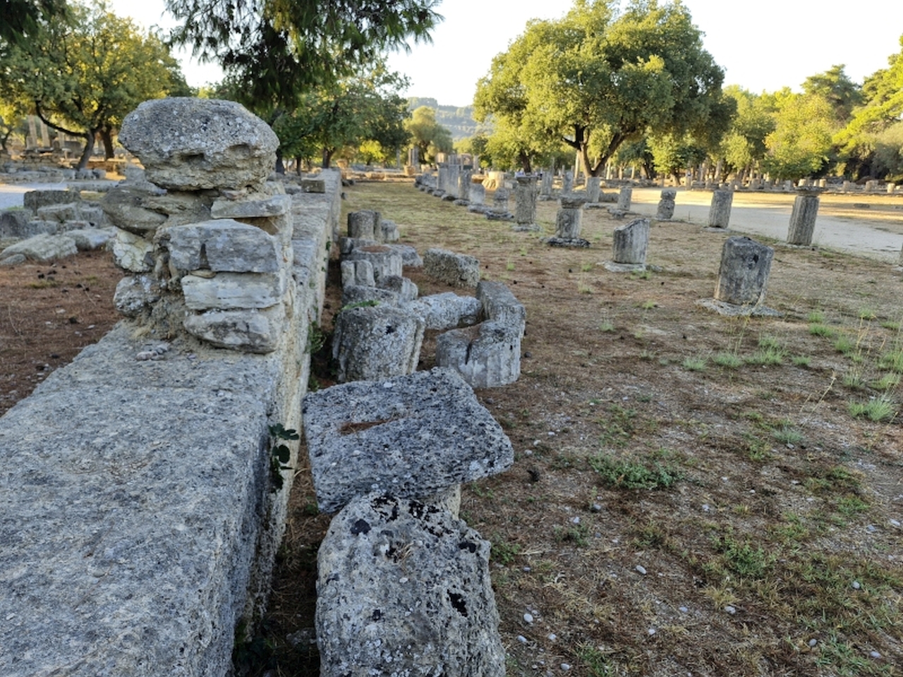 * Wytyczoną przez 16 postumentów z posągami Zeusa tzw. Aleja Hańby. Zawodnicy łamiący zasady zawodów musieli zapłacić grzywnę i za te pieniądze odlewano posągi boga. Aby wejść na stadion, trzeba przejść tą aleją.
