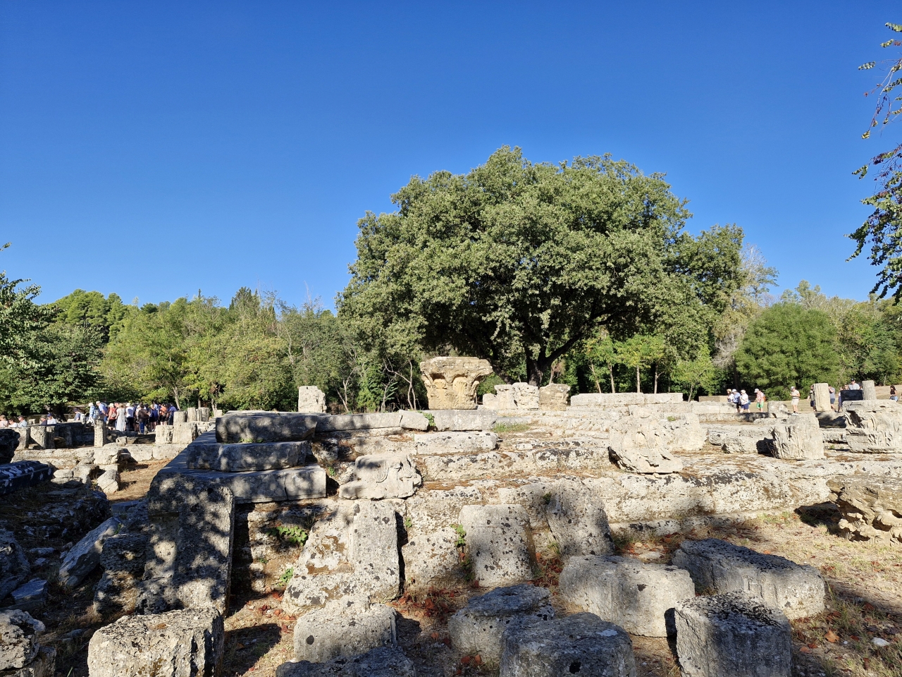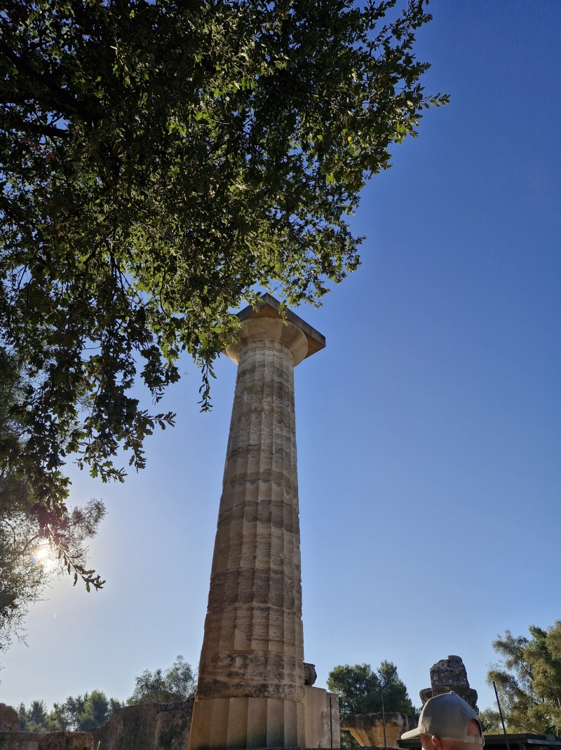 Były tu dwie świątynie – świątynia Hery (to stąd rozpoczyna się droga ognia olimpijskiego) i świątynia Zeusa, w której stał tronujący na Olimpie jego posąg, dzieło Fidiasza. W tym miejscu stoi samotna kolumna w stylu doryckim.