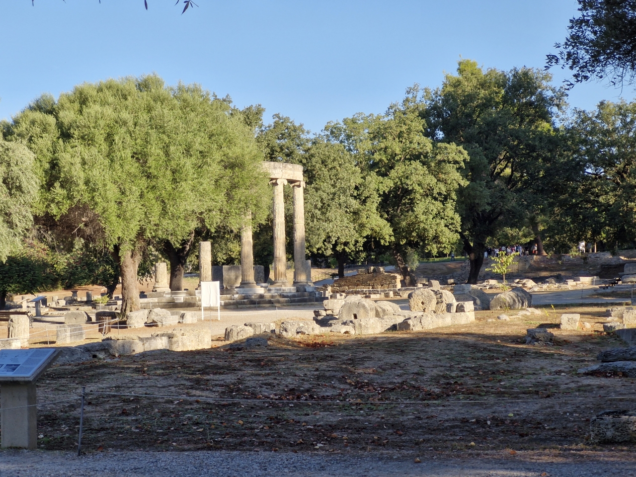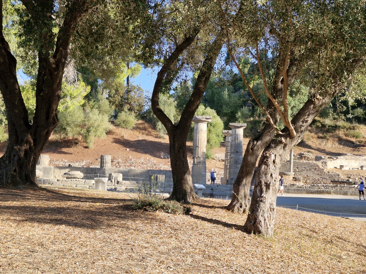 * Dwie świątynie – świątynię Hery (to stąd rozpoczyna się droga ognia olimpijskiego) i świątynię Zeusa, w której stał tronujący na Olimpie jego posąg, dzieło Fidiasza. W tym miejscu stoi samotna kolumna w stylu doryckim, wskazująca, jak wysoka była cała budowla. Była też w Olimpii, bo zastały z niej tylko marne resztki, najmłodsza świątynia – Filipejόn – ufundowana przez Filipa II, ojca Aleksandra Wielkiego.