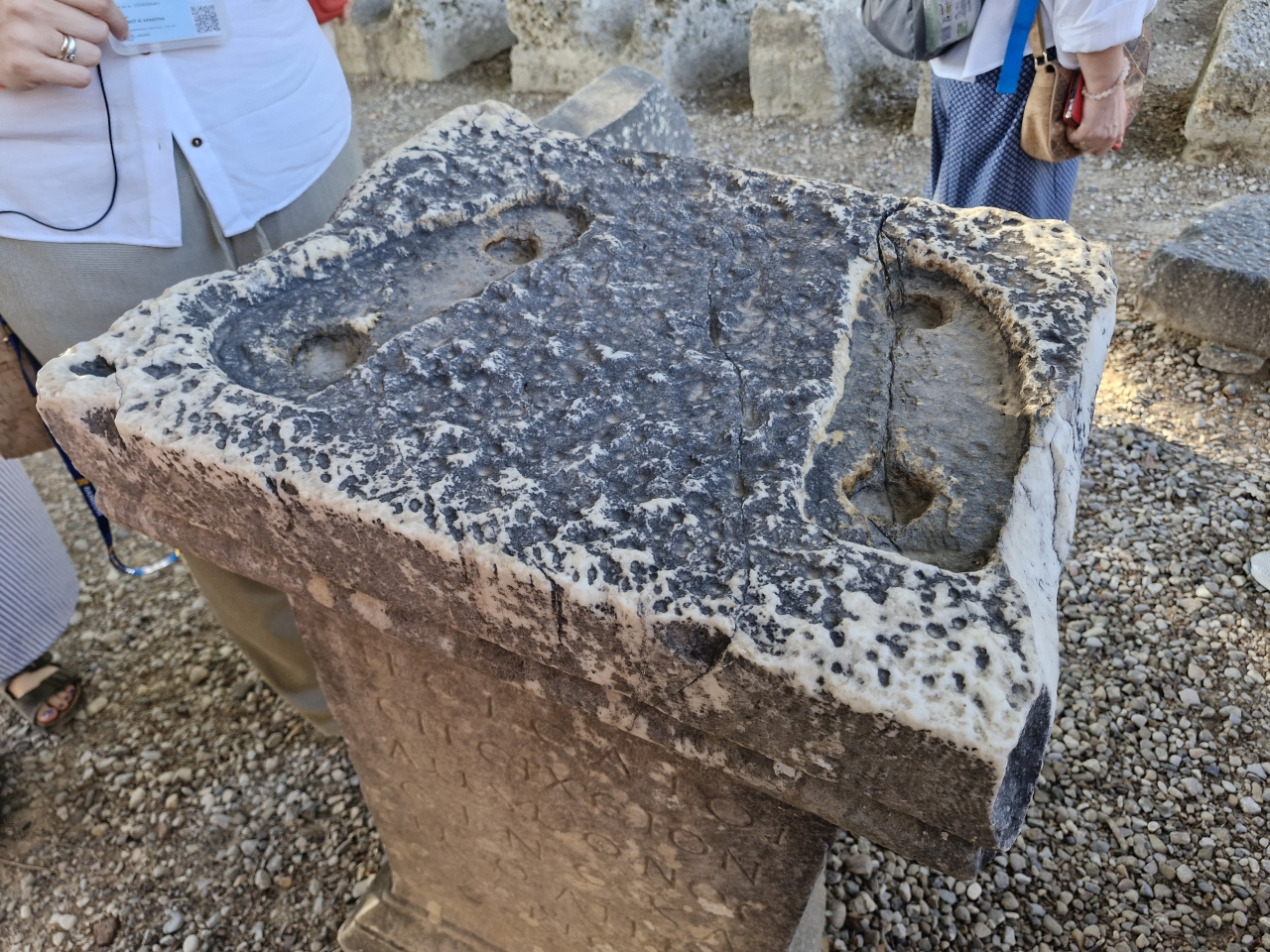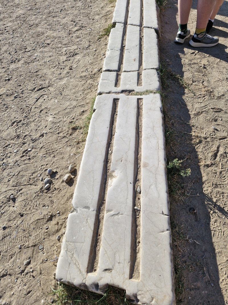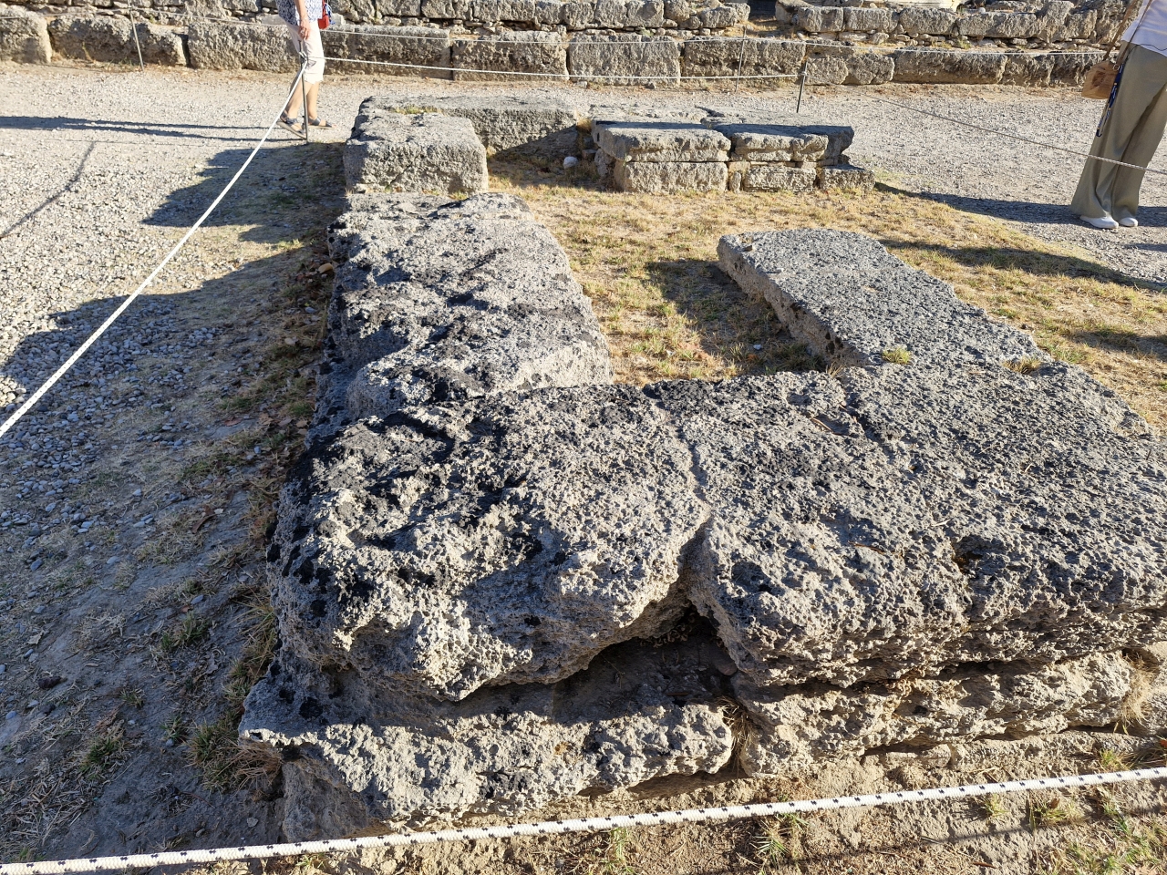 * Stadion, który nie robi wrażenia ogromnego, chociaż przewidziany jest na 40 tys. widzów. Do stadionu prowadzą propyleje. Meta i start to kalka desek, na których zawodnicy pochyleni jak współcześnie, w karkołomny wręcz sposób ustawiali stopy.