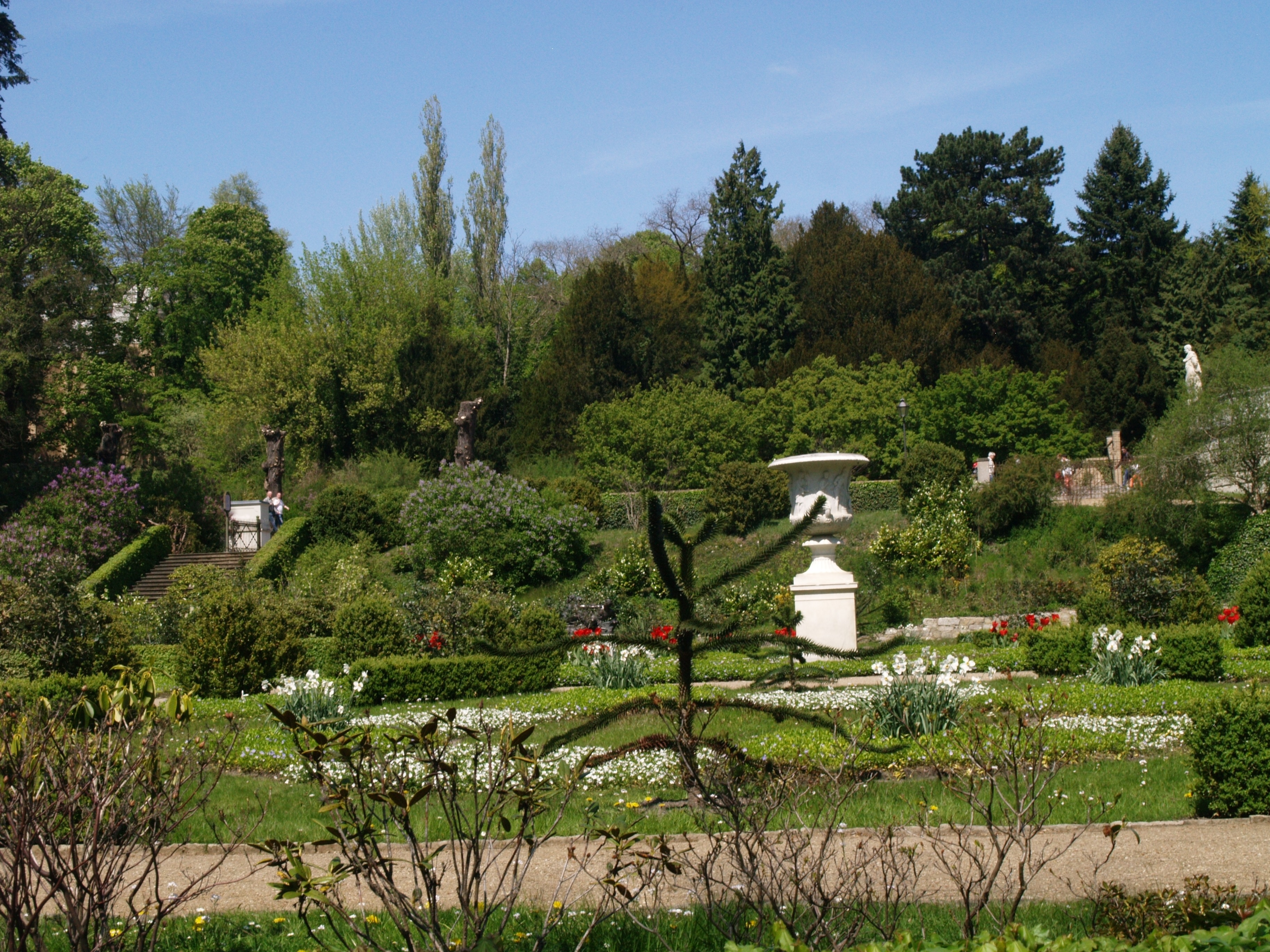 Już król Fryderyk Wilhelm I zwany „królem – sierżantem” miał tutaj swoje ogrody i szklarnie, to jednak dzieło stworzenia Sanssouci zaczęło się w 1744 roku, gdy na południowym stoku wzniesienia Bornstedt urządzone zostały ogrody tarasowe. Inicjatorem takiego zagospodarowania wzniesienia był Fryderyk II Wielki. Chciał, jak mówią przekazy, mieć śliwki, figi i winorośl na wyciągnięcie ręki. Na stoku powstała winnica. Pod okiem architekta Friedricha Wilhelma Diterichsa stok został podzielony na sześć szerokich tarasów ze ścianami oporowymi i 168. niszami. Po murze pięła się winorośl, a w oszklonych niszach rosły figi. Oś środkową zbocza wypełniają imponujące schody.