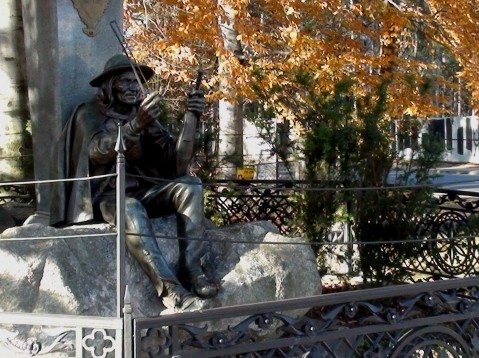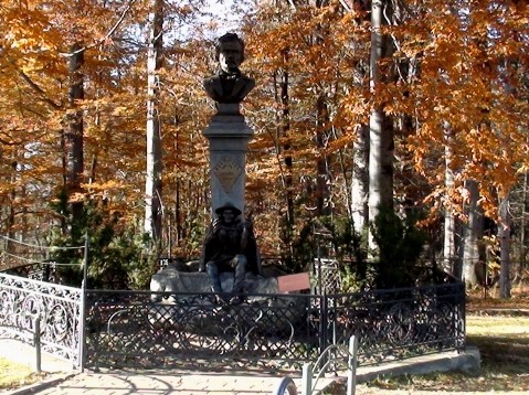 O tym pomniku nie mówi się inaczej niż „pomnik Sabały”. To najsłynniejszy zakopiański pomnik. Zaprojektował go Stanisław Witkiewicz a wykonał Jan Nalbarczyk. Monument odsłonięto go 15 sierpnia 1903 r. Pomnik to kolumna ustawiona na kopcu z głazów. Na niej znajduje się popiersie Chałubińskiego. O kolumnę wsparta jest naturalnej wielkości postać siedzącego górala. To Jan Krzeptowski-Sabała. Sabała trzyma w ręku gęśle zwane też złóbcokami – to archaiczny dziś instrument. W drugiej ręce miał trzymać smyczek, ale zbyt często padał on ofiarą kradzieży, więc w czasie kiedy tam byłam, groził tylko palcem. W ubiegłym roku ponownie otrzymał smyczek i może tak już zostanie…