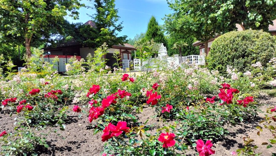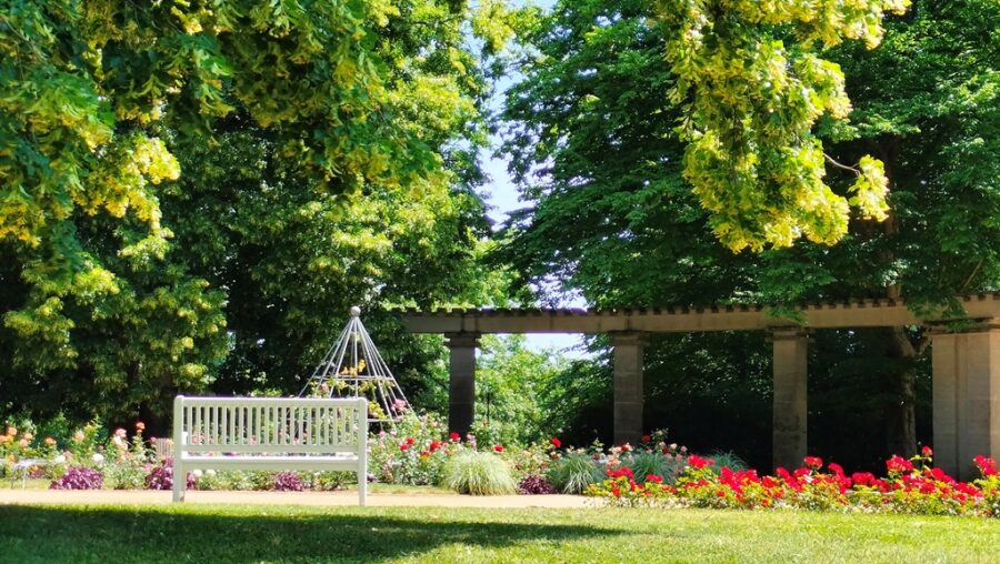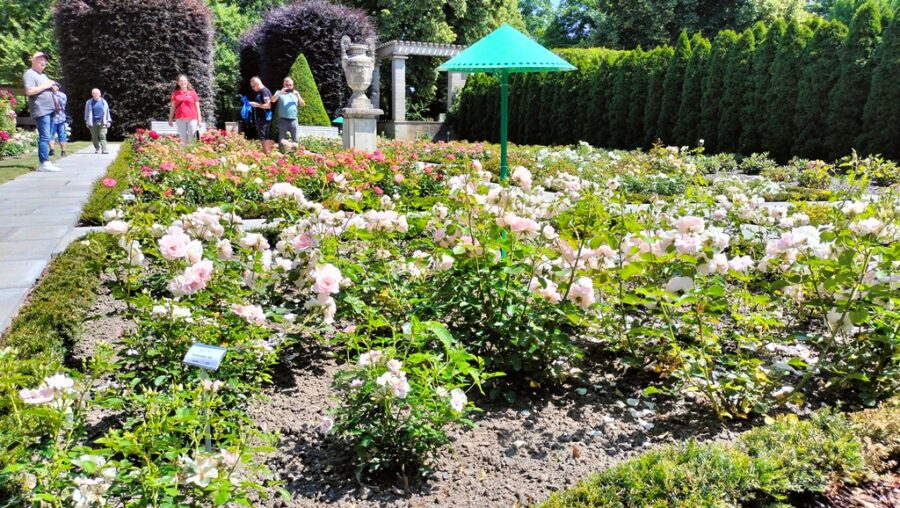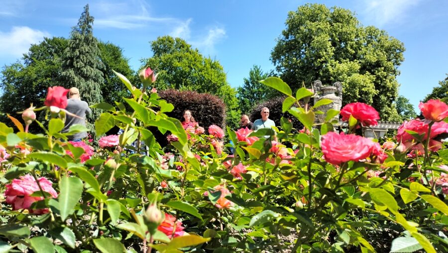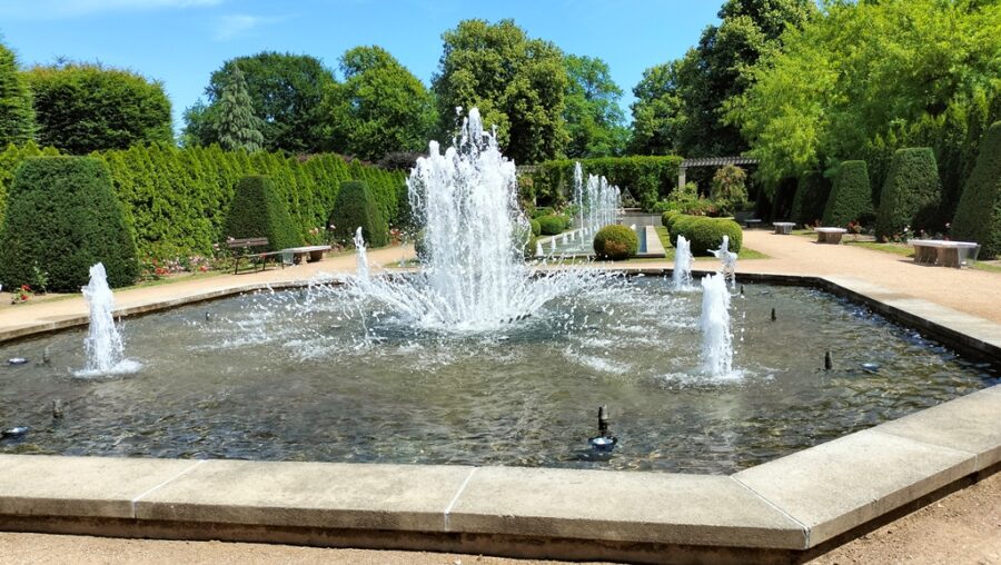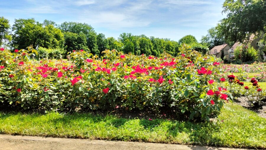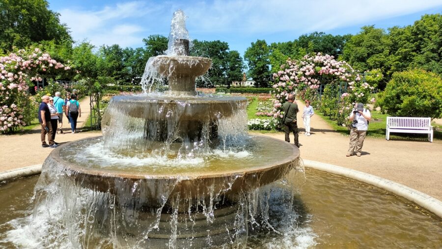Park różany to nie tylko po prostu plantacje kwiatów. Te są doskonale zaaranżowane jako elementy większej koncepcji. Ogrody tematyczne, secesyjne fontanny i rzeźby stanowią równie piękne dopełnienie wystroju.