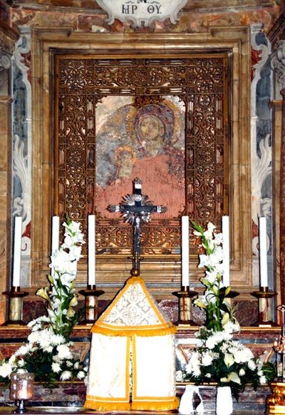 Poniżej, na zboczu skały znajduje się Sanktuarium Maryjne, do którego schodzi się po kamiennych schodach. To kolejna świątynia oraz stary klasztor z obszernym prostokątnym dziedzińcem na który wchodzi się przez ozdobną bramę lub od strony wyższej części wzgórza. Ze znajdujących się na tym dziedzińcu od strony morza arkad roztacza się przepiękny widok na zatokę i okoliczne miejscowości – aż po sąsiednie wyspy: Comino i Gozo. Na bocznych ścianach dziedzińca umieszczono jednolite, duże tablice z białego marmuru, z wykutymi na nich tekstami modlitwy do Matki Bożej z Mellieħy w kilku językach, w tym polskim.