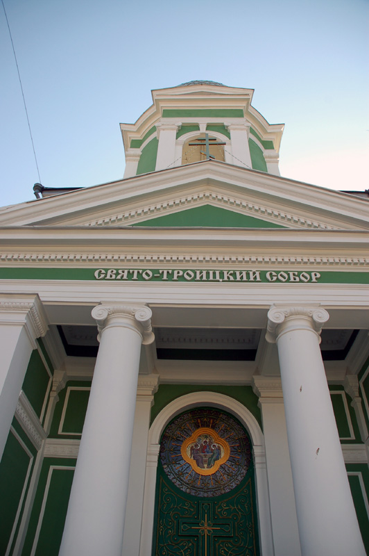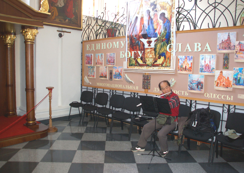 Zawsze zastanawiało mnie dlaczego w tej dużej i kulturalnej przecież metropolii jest tak mało teatrów. Obecnie zaledwie siedem, w tym także Lalek i Młodego Widza oraz Dom Klaunów. Niewielki wybór mają tu również miłośnicy starych, a przynajmniej interesujących świątyń. Właściwie poza soborem Swjato-Trockim (Trójcy Świętej) z 1808 roku z klasycystycznym frontonem oraz także nie powalającą z nóg XIX-wieczną katedrą katolicką z nowym posągiem Jana Pawła II po prawej stronie głównego wejścia i wieży, to w celach poznawczo-turystycznych warto zajrzeć może do jeszcze dwu-trzech. Chociaż w katedrze trochę zaskoczony zostałem ekspozycją „Jedynemu Bogu Chwała” z dużą reprodukcją sławnej ikony „Trójca” Andreja Rublowa, obrazami wielu świątyń z przesłaniem „Wielonarodowa duchowość Odessy” i grającego na tym tle na flecie Chińczyka.