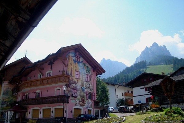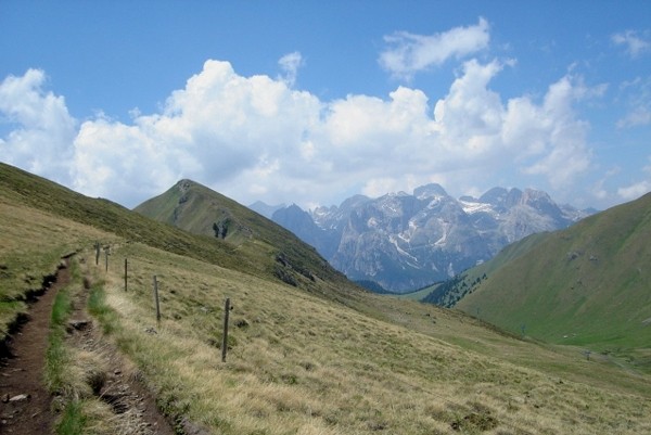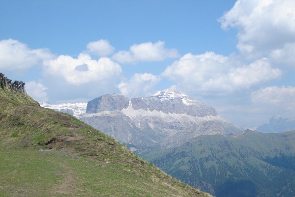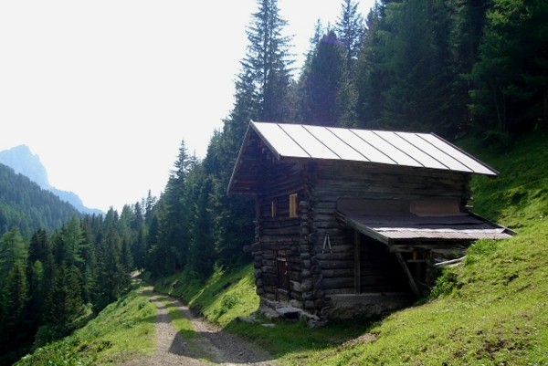 Jesteśmy już w Malga Jumela: kilka domostw, restauracja, kaplica, stare spichlerze. Stąd można iść w kierunku Rifugio Bufare czyli stacji przesiadkowej na Col Valvacin. Schodzimy: już prześwitują zabudowania Pozzy. Z prawej strony (przy zakręcie) góruje Sas de P ? re da Fech, na którego szczycie jest krzyż.