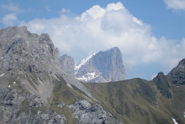 Jesteśmy już pod pensjonatem-restauracją El Zedron. Pięknie tu. Zielony szczyt naszego grzbietu otoczony białymi skałami dolomitowymi. W dole, z prawej, Val di San Nicolo, a z lewej ? Jumela. Na szczyt Sas d’Adam ścieżka nr 613 wprowadza zakosami. Stąd rozciąga się rozległa panorama grup górskich, po których już wędrowałam: Sella, Sassolungo, Catinaccio i wiele innych. Pięknie prezentuje się południowa i zachodnia strona Marmolady. Po prawej podgrupa tego masywu ? Dolomiti Fassani.
