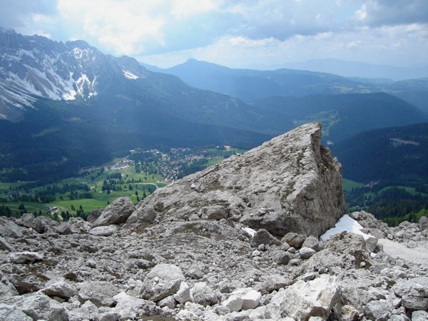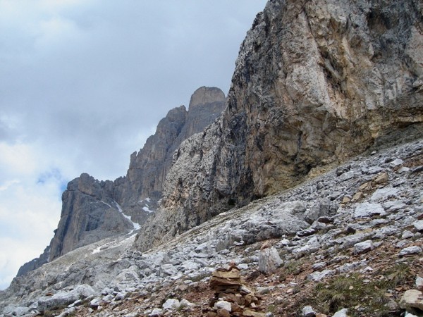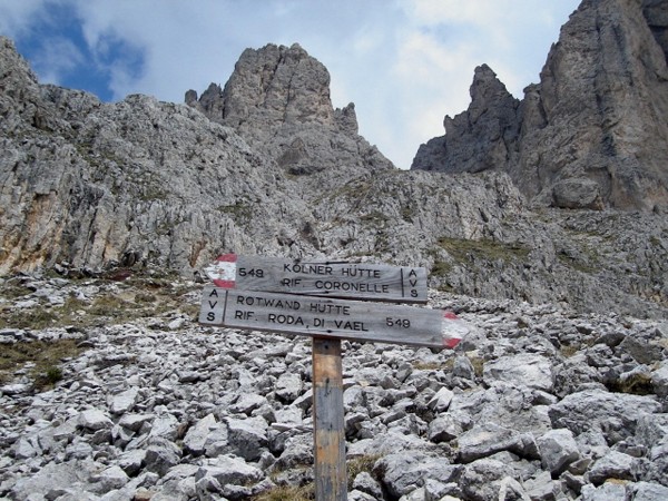 Spod schroniska Fronza-Coronelle schodzimy drogą nr 549, czyli tą samą, która doprowadziła nas z Rif. Paolina. Przy skrzyżowaniu szlaków skręcamy lekko w lewo na wąską kamienistą ścieżkę, oznakowana nadal numerem 549 i prowadzącą w kierunku Passo Vaiolon. Z daleka już widać charakterystyczny ogromny głaz, na który można wejść za pomocą drabinki. Otoczenie tu jest bardzo dzikie. Ścieżka wije się pomiędzy złomami skalnymi, a w górze wznosi się ogromna ściana Roda di Vaél. Pomiędzy głazami harcują świstaki. Z tej ścieżki w prawo odprowadza szlak na Passo Vaiolon, ale my tam się nie wybieramy. Sprawni turyści powinni jednak ruszyć w tym kierunku, aby zobaczyć piękną i gładką zachodnią ścianę Roda di Vaél.