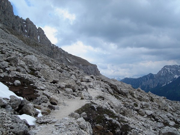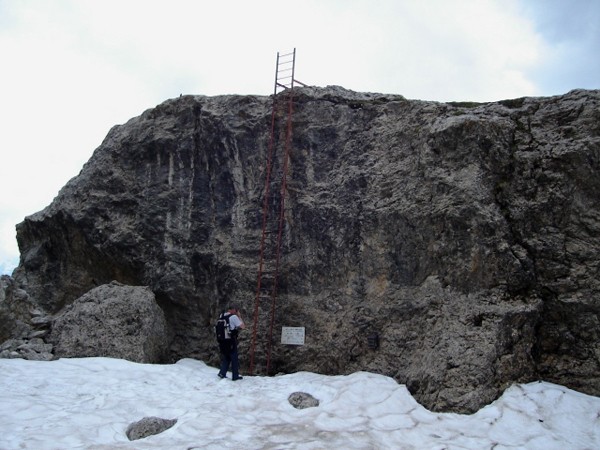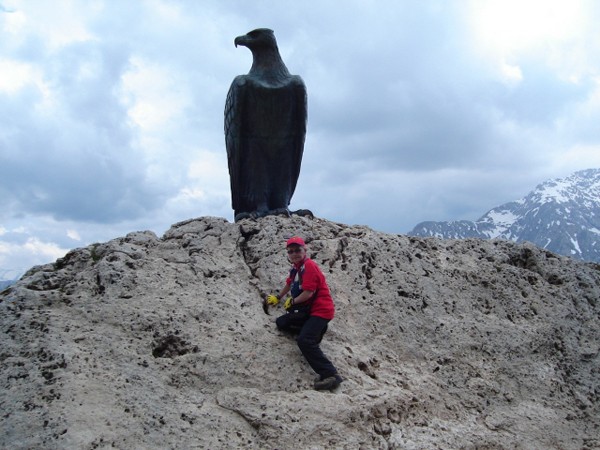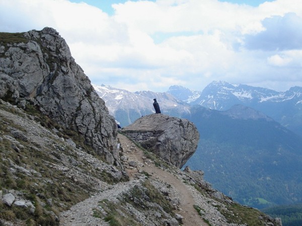 Mijając głaz podążamy dalej. Ścieżka, chociaż wąska, jest bardzo fajna. Wkrótce ukazuje się pomnik Christomannosa ? wielkich rozmiarów orzeł usytuowany na skale. Obok stoi kamienna ława, na której można spocząć. Spod pomnika sprowadza ścieżka nr 552 pod rifugio Paolina lub do przełęczy Costalunga widocznej z góry.