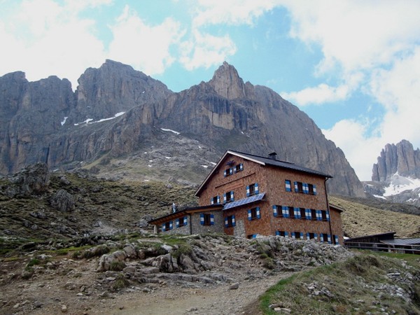 Będąc już pod pomnikiem, koniecznie należy iść dalej ścieżką 549 pod schronisko Roda di Vaél. Ścieżka jest szeroka i wygodna, a prowadzi wokół grzbietu kończącego grań Masare. Schroniska jakie znam w Dolomitach są w kolorze białym lub popielatym z niebieskimi okiennicami. Rifugio Roda di Vael też takie było do 2008 r. Wtedy to przeprowadzono remont i w 2010 r. zastałam je w kolorze czerwonym. Okiennice zostały niebieskie. Poniżej tego schroniska, na małej przełączce przy ścieżce stoi bufet Baita Pederiva. Noclegi oferuje tylko w wyjątkowych sytuacjach.