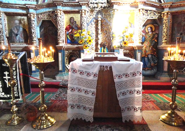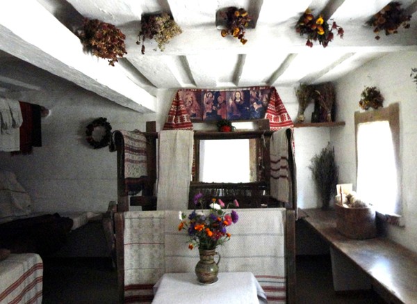 Podobnie w cerkwi ? byłem tylko w jednej, na więcej czasu nie starczyło: z zabytkowym, rzeźbionym w drewnie i malowanym ikonostasem, ikonami, świecznikami, a także specjalnymi, charakterystycznymi dla świątyń ortodoksyjnych metalowymi podstawkami, z dziesiątkami uchwytów w które wstawia się zapalone cieniutkie świeczki intencyjne. Także tu, w skansenie, zapalane i wstawiane jak w czynnych cerkwiach, co tylko dodaje autentyzmu. W niektórych zabytkowych chatach są sklepiki z pamiątkami ? ludowymi krajkami, haftowanymi koszulami, kilimami, rzeźbami w drewnie, ceramiką, kowalstwem artystycznym itp. Lub bufety.