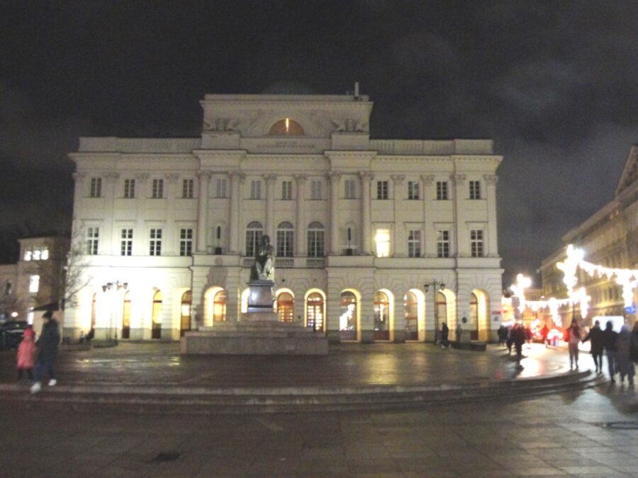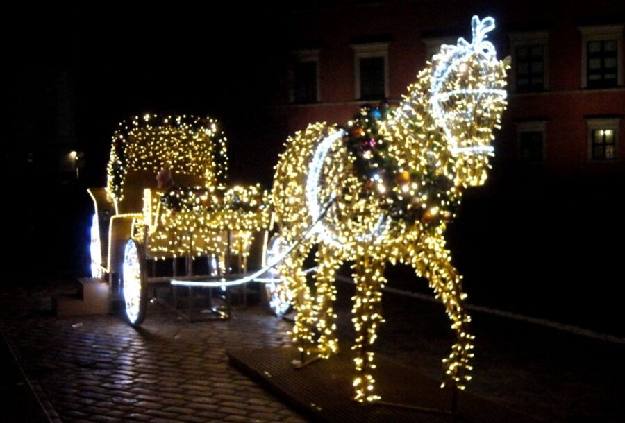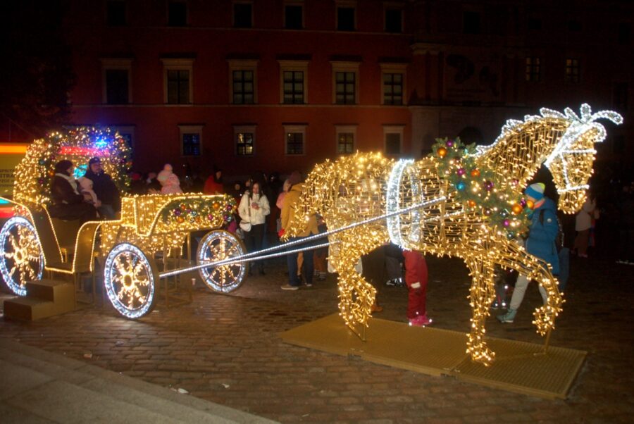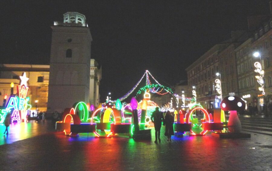 A jeszcze bardziej dwie iluminowane niezliczonymi lampkami dorożki, do których można wsiadać i robić sobie zdjęcia. Centralną przestrzeń placu zajmuje nowoczesna instalacja o jaskrawych barwach oraz kilkumetrowej wysokości napis „W/ARS/AWA”. Niemal bez przerwy oblegany, gdyż stanowi wyróżniające się tło dla pamiątkowych fotografii. Zniknęła jednak, stojąca w ostatnich latach kilkanaście metrów dalej w kierunku Krakowskiego Przedmieścia, świetlna, bardzo popularna scenka dwu warszawskich cwaniaków z XIX wieku.