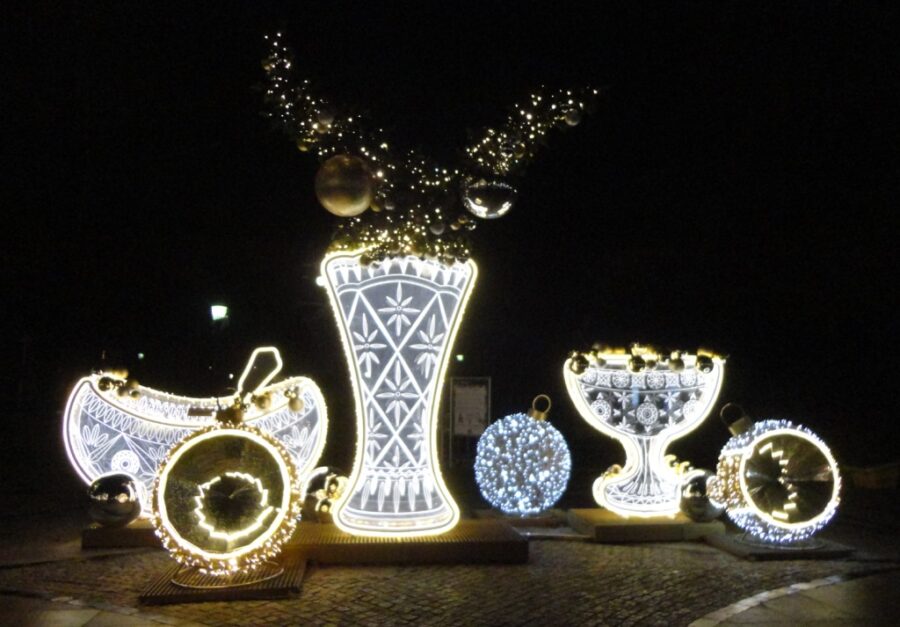 Stoją również zabawne figury w kręgach, oświetlone wielobarwnymi lampkami.