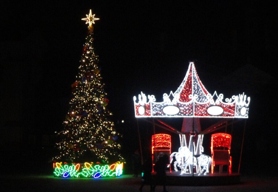 Całość oświetlona jest tysiącami lampek, z kilkoma wielobarwnymi choinkami i innymi dekoracjami. W porównaniu z rokiem ubiegłym nie ma jednak witających gości świetlnych napisów „Wesołych Świąt”...