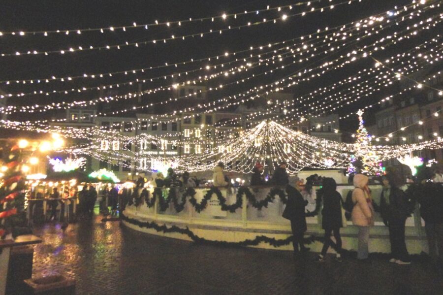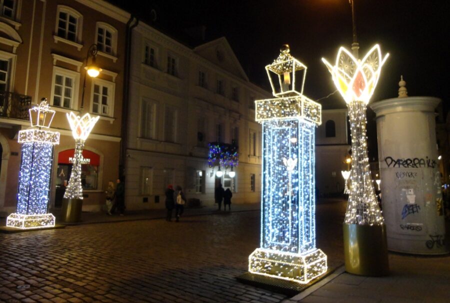 Iluminacje te znajdują się w kilku punktach miasta, ale główne i najważniejsze zdobią początek Szlaku Królewskiego, od Starego Miasta do Ronda de Gaulle’a. Zaczynają się, idąc od północy, na Rynku Nowomiejskim. Skromniutko. Niezbyt rzucającą się w oczy choinką oraz wielobarwnie oświetloną karuzelą. Poza nimi oraz rozjaśnionym kościołem św. Kazimierza Królewicza jest tam ciemnawo. Tradycyjnie, podobnie jak w latach poprzednich, oświetlona jest ulica Freta do Barbakanu i dalej Nowomiejska do Rynku Staromiejskiego. Zajmuje go, czynne mimo dodatnich temperatur i cieszące się powodzeniem, sztuczne lodowisko otoczone od strony zachodniej świątecznymi kramami małej gastronomii.