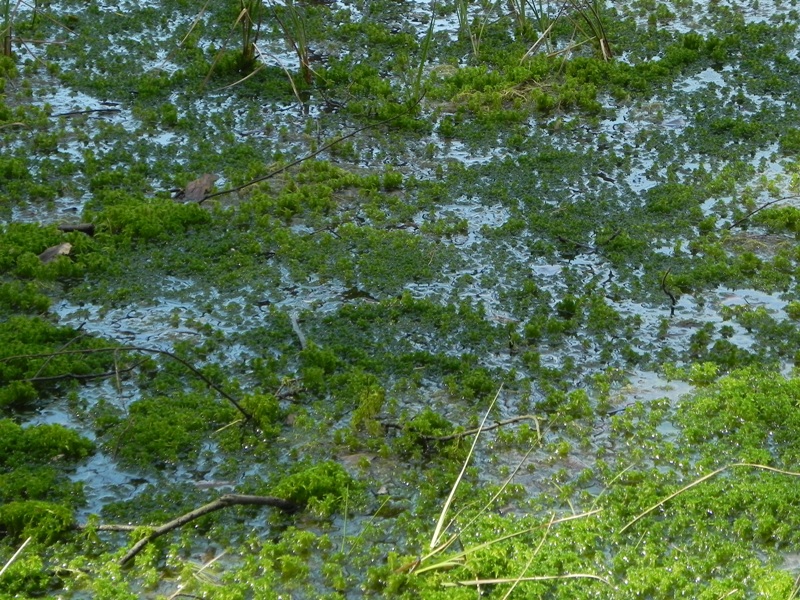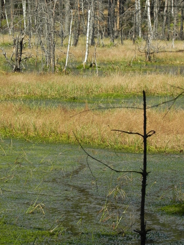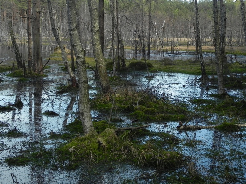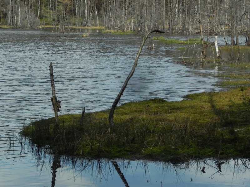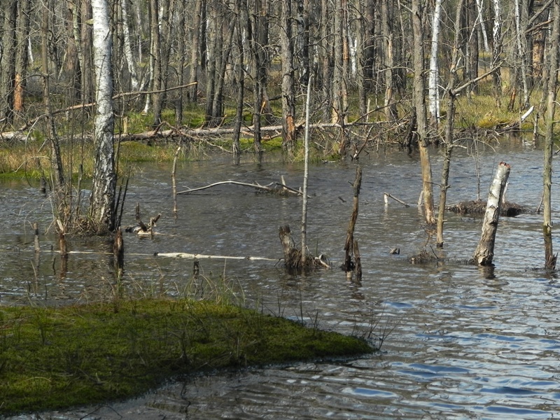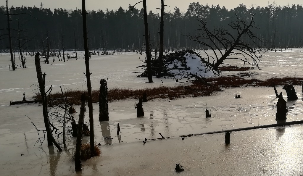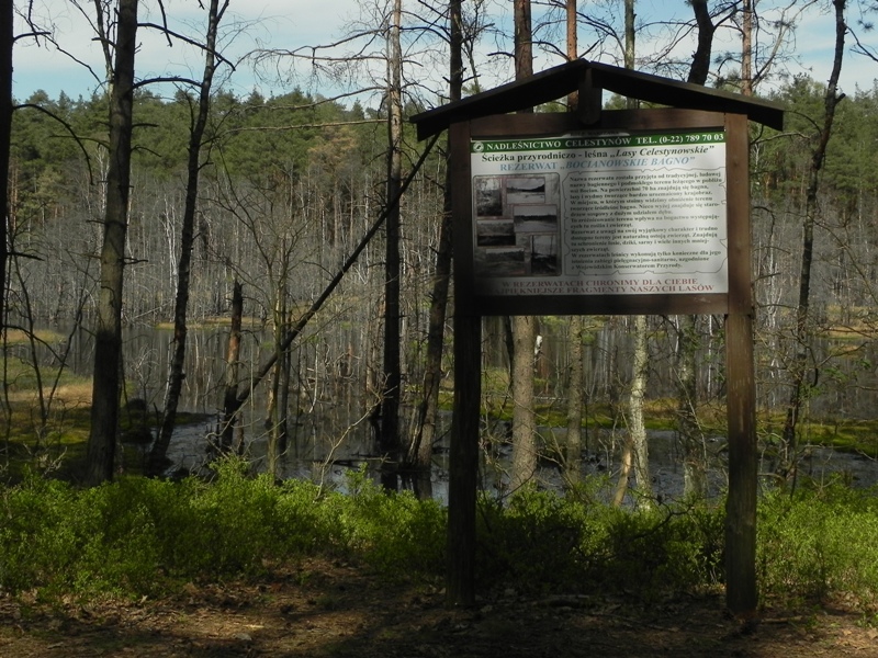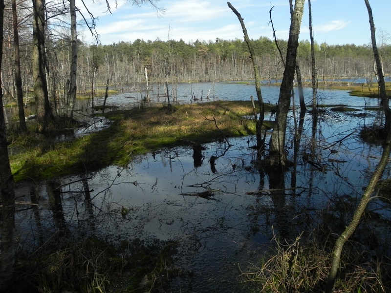 Już po kilkudziesięciu metrach znajdujemy jednak pierwszą z tablic ścieżki dydaktycznej. Wkrótce, przy wiatce na rozstaju dróg skręcamy w prawo. Znów nikt nie pomyślał o drogowskazie. Droga wprowadza po kolejnych kilkudziesięciu metrach na groblę, którą dochodzimy do śródleśnego bagiennego jeziorka. Suche pnie drzew sterczą malowniczo z wody i z pokrywającego brzegi torfowiska. Niestety, nie da się podejść zbyt blisko, podłoże ugina się przy każdym kroku. Mokro.