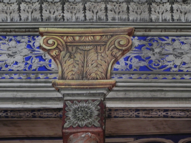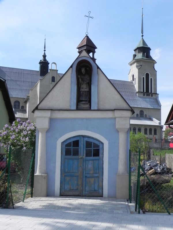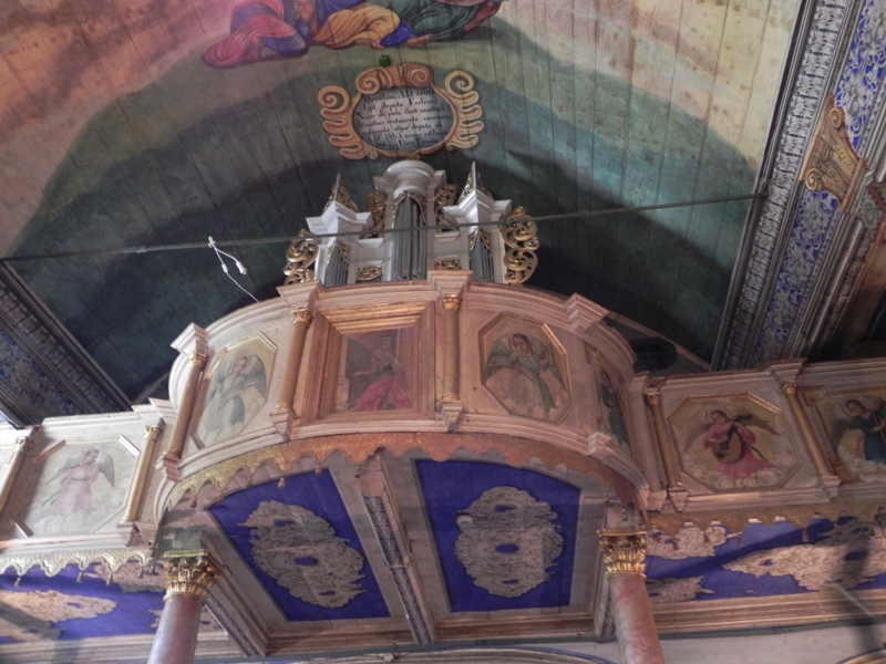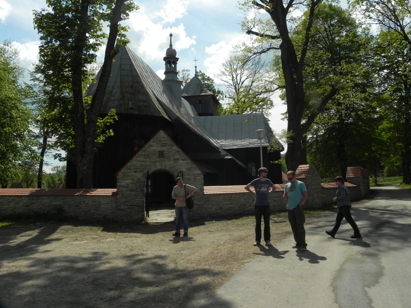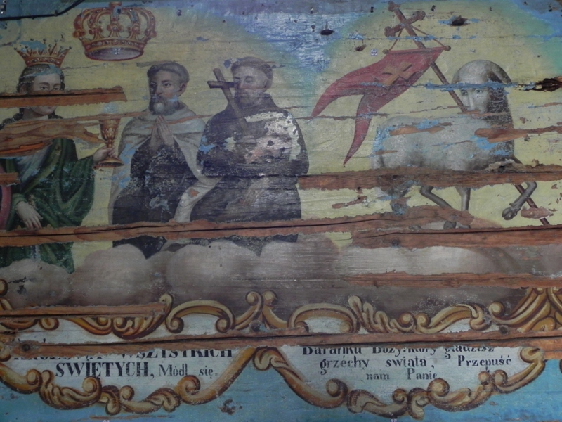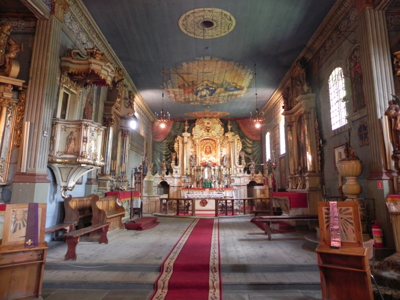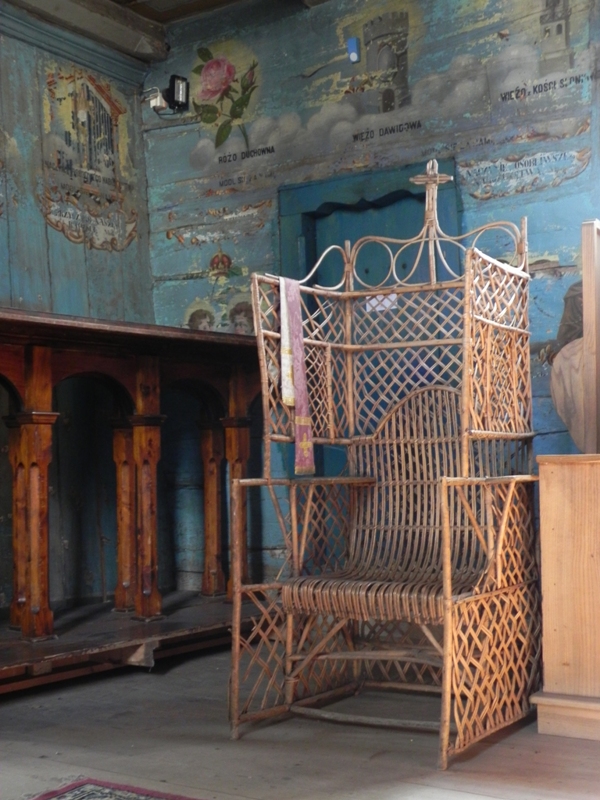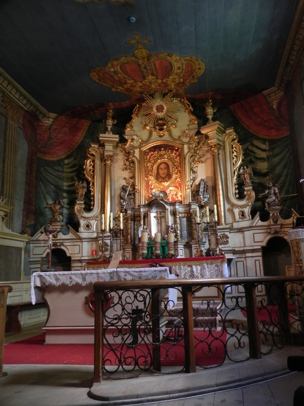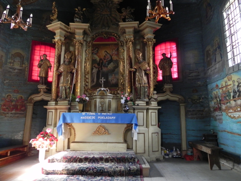 Zatrzymaliśmy się tu jednak, by zobaczyć stary kościół. Stanął tu w 1684 roku (metryka parafii sięga roku 1361 roku) i nosi wezwanie świętych Szymona i Judy Tadeusza. Jest zbudowany z drewna, zrębowy z przysadzistą wieżą konstrukcji słupowej. Dach kryty blachą. Trójnawowe wnętrze zawiera barokowe i rokokowe wyposażenie, XVIII-wieczne polichromie zdobią ściany. Część z nich już odnowiono, część właśnie podlega konserwacji. W ołtarzu głównym znajduje się ikona typu Veraicon (przedstawia oblicze Chrystusa, którego twarz odbiła się na chuście św. Weroniki, gdy ocierała z potu jego twarz w drodze na Golgotę), malowana na desce. To XIX wieczna kopia obrazu z XVII w. Wnętrze bogate, ale nie przeładowane. Ładne. Moją uwagę zwrócił też wiklinowy konfesjonał, takiego jeszcze nie widziałam.