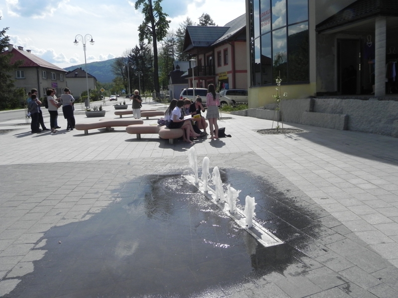 Wieś Dobra. Wiele nosi tę nazwę w Polsce. Ta leży w powiecie limanowskim i jest siedzibą gminy. Małomiasteczkowa zabudowa, na centralnym placyku malutka nowoczesna fontanna i frymuśne ławeczki. Ponoć to projekt wójta? Kostkowe chodniczki, parking przed gminą, nowy plac zabaw. Ogarnięte, posprzątane. Czysto.