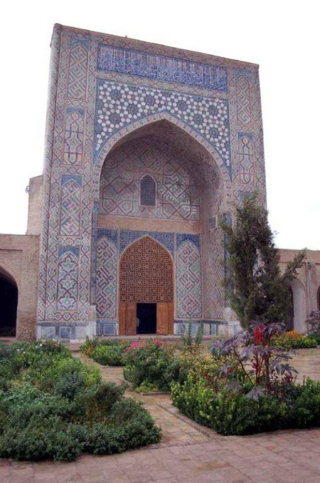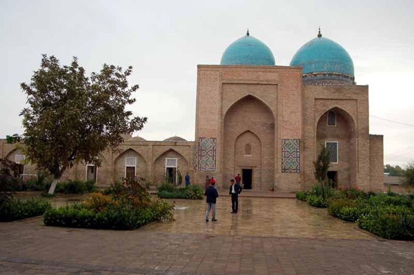 W pobliżu stoi, podobnie jak w Samarkandzie, Taszkencie i innych miastach, duży pomnik Tamerlana. Pod nim spotykamy nowożeńców i ich licznych gości z dwu lub trzech wesel. Jest bowiem w uzbeckim zwyczaju, aby po uroczystości zaślubin, a przed ucztą, złożyć kwiaty w najważniejszym miejscu. Niestety dla nas, chociaż z entuzjazmem przyjęte zostało to przez miejscowych, bo nie padało tu od pół roku, zaczęło trochę kropić, co utrudniło nam fotografowanie.