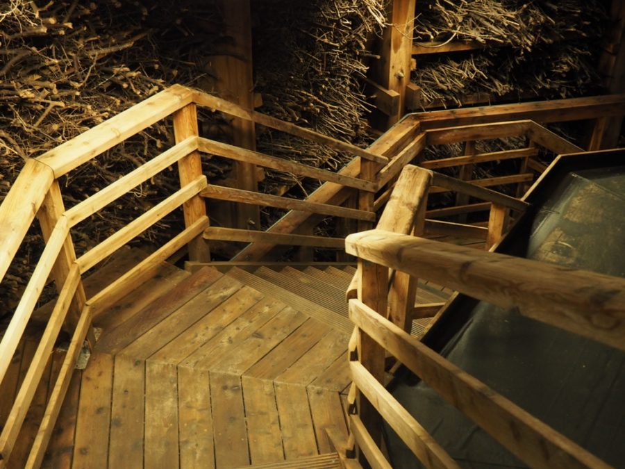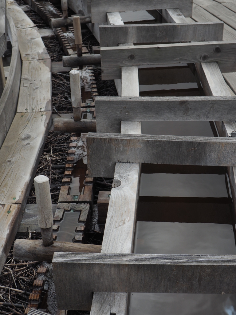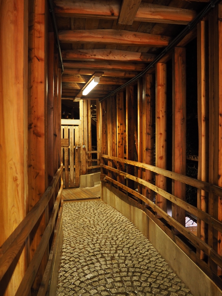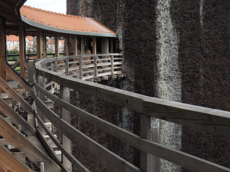 Tam zobaczymy – oprócz panoramy kopalni i Wieliczki, jak z podziemnego zbiornika solanka jest pompowana do systemu koryt drewnianych zlokalizowanych na koronie muru i na podeście wieży. Stąd przez drewniane kurki regulujące przepływ spływa do mniejszych koryt i jest rozprowadzana na ściany z tarniny.