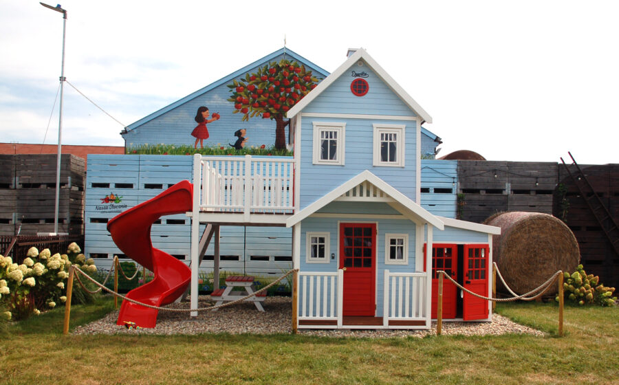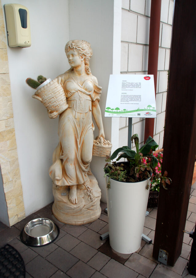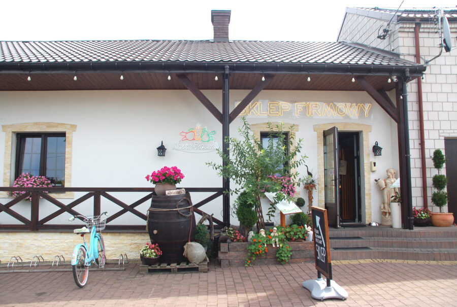 Wizyta w tej tłoczni w pierwszym momencie nie robi specjalnego wrażenia. Widzimy niewielki, parterowy i długi budynek w którym znajduje się sklep firmowy z sokami oraz przetworami owocowymi. Nie możemy obejrzeć linii produkcyjnych, gdyż w trakcie pracy wykluczają to względy sanitarne. Ale możemy zobaczyć wszystko pozostałe. Przede wszystkim rozległy sad jabłkowy, do którego prowadzi brama z ogromnymi, wielokrotnie powiększonymi czerwonymi jabłkami oraz… sztuczna żyrafa.