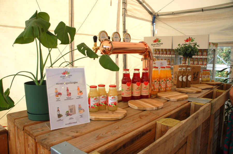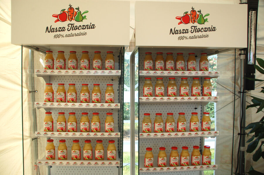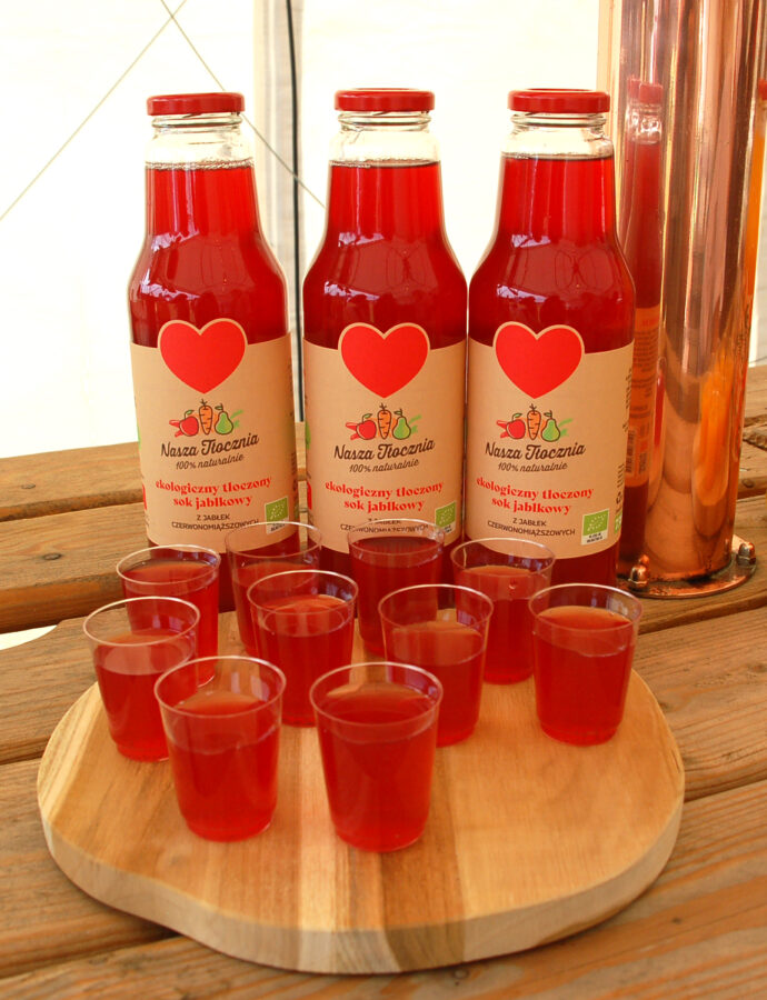 „Nasza Tłocznia” organizuje bowiem także wycieczki edukacyjne po sadzie, z pokazami tłoczenia soku, zrywaniem jabłek, ogniskami oraz atrakcjami dla dzieci. W pawilonie degustacyjnym jest długa lada z urządzeniami do nalewania soków bezpośrednio z większych pojemników, prezentacją butelek. Są także oszklone szafy chłodnicze z podstawowym tutejszym produktem, sokiem z jabłek. Ale to tylko jeden z wytłaczanych tu napojów. W programie degustacji jest ich sześć.