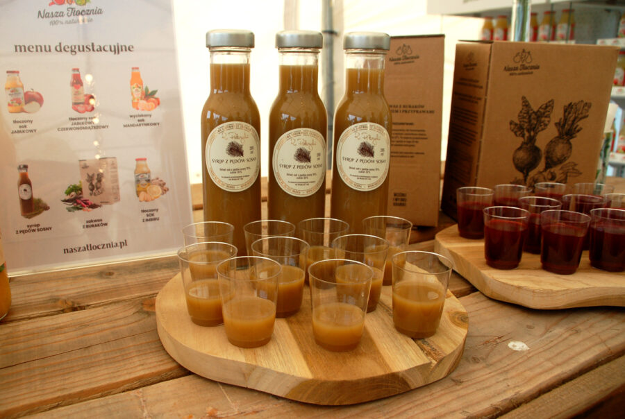 Tłoczone to sok jabłkowy, sok jabłkowy czerwonomiąższowy i z imbiru. Ponadto wyciskany – to drugi, ważny sposób ich pozyskiwania – mandarynkowy. A także syrop z młodych pędów sosny oraz zakwas z czerwonych buraków. Ich próbki w małych szklaneczkach czekają już na nas na ladzie, ustawionych obok butelek z ich nazwami. Każdy sok smakuje inaczej.