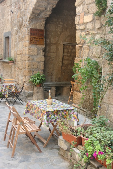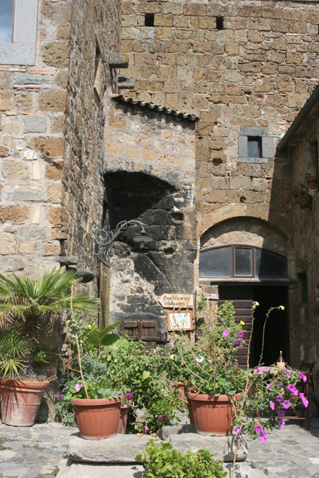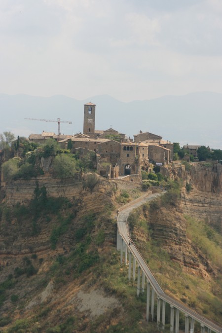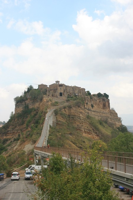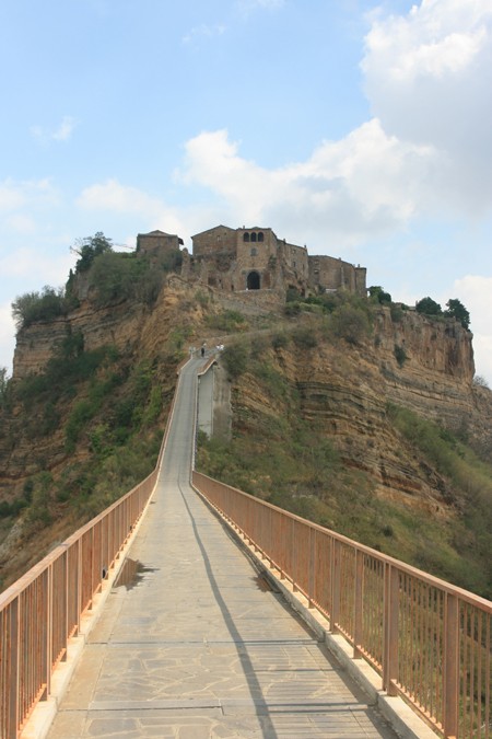 Samochód zostawiamy na krańcu Bagnoregio, stąd już tylko pieszo. Obie miejscowości łączy betonowa, kilkusetmetrowa kładka, powoli wznosząca się ku górze. Z początku kładki najlepiej widać cel naszej wyprawy. Nieco bajkowo wyglądają budynki wieńczące samotną skałę. Wzgórze było zamieszkiwane od epoki żelaza, mocno zaznaczyli swą obecność tutaj Etruskowie. Ostre zbocza tufowe opadają ku płynącym poniżej dwóm rzekom: Chirac i Torbido. Dolina oraz okoliczne wzgórza i formacje skalne toną w zieleni. Civita i Bagnoregio zawsze były połączone mostem. Oba grody rozwijały się dość harmonijnie, oba pod wpływem rodów rządzących niedalekim Orvieto.