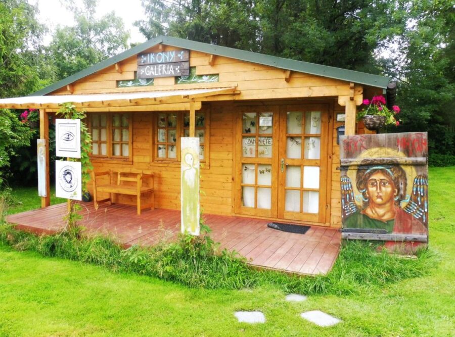 Okazało się że do tej galerii mamy z naszej kwatery tylko około 400 metrów. Jej właścicielką jest pani Katarzyna Wolan która pisze ikony od roku 2006. Pasjonując się ikonami tworzy całkiem nowe interpretacje własne, jak i kopie już istniejących ikon. Ikony pani Katarzyny Wolan są zamawiają odbiorcy prywatni, ale też trafiają one do cerkwi lub do galerii.