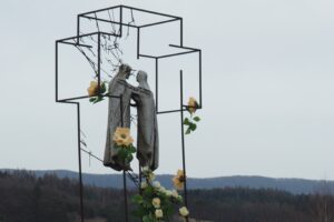 Od kościoła Sanktuarium Matki Bożej Zagórskiej Matki Nowego Życia do ruin klasztoru jest ok. 950 m. Idąc mijamy pomnik papieża Jana Pawła II, który był tu kilka razy jadąc w Bieszczady. Do Krakowa wracał koleją ze stacji w Zagórzu. Dalej po drodze mijamy drogę krzyżową, a jej stacje są galerią rzeźby bieszczadzkiej. Każdą z nich wykonał inny artysta związany z Zagórzem lub regionem. Wykonano je w drewnie, kamieniu i metalu. Stacja XIII, „Pan Jezus zdjęty z krzyża i złożony na łonie Matki”, znajduje się już na murze klasztoru, przy wejściu.