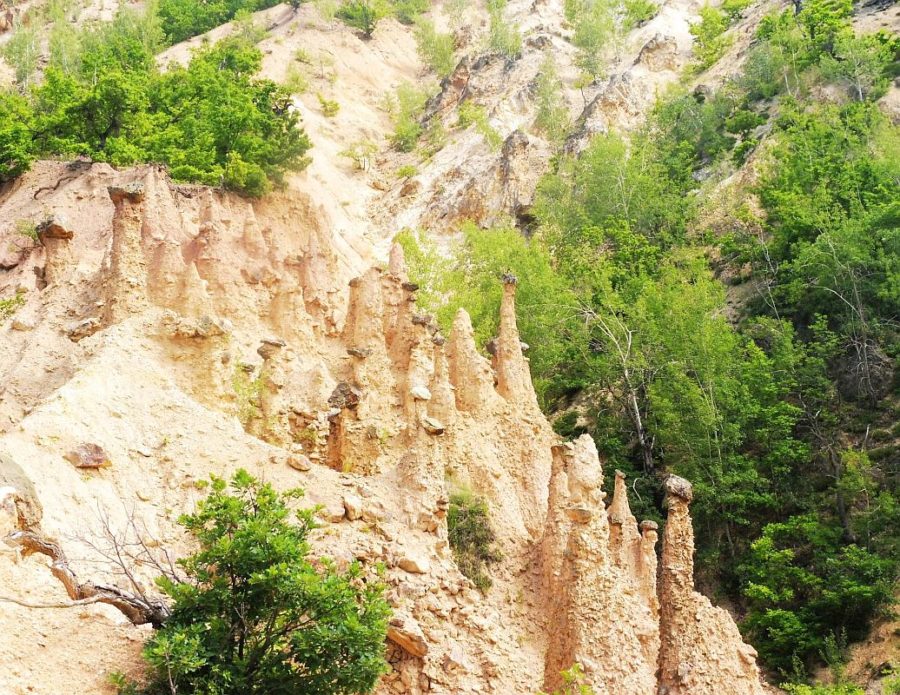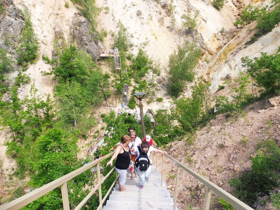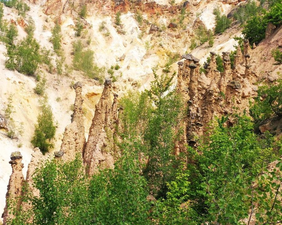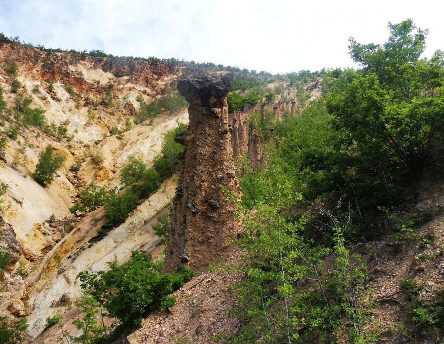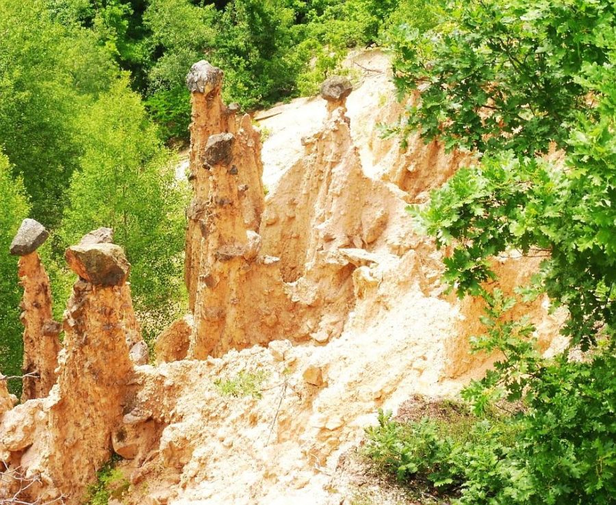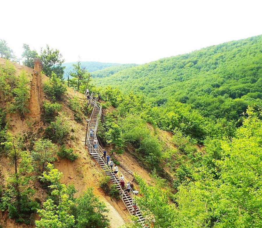 Idąc dalej przez las zobaczyliśmy skały w kształcie grzybów. Uczeni twierdzą że te skały powstały na skutek erozji wulkanicznej sprzed milionów lat, o czym świadczą czapki w postaci głazów andezytowych. Z czasem materiał wulkaniczny uległ erozji i pozostawił cienkie kolumny. W sumie dolinę ozdabiają 202 stożkowe kolumny o wysokości od 2 do 15 metrów i średnicy od 0,5 do 3 metrów. Dzięki schodom można mieć udaną sesje fotograficzną tych skalnych grzybków. Widok ze schodów jest fascynujący i na te kolumny i na pobliskie góry. Zdjęcia robiłem w słoneczny dzień w czasie tej sesji fotograficznej.