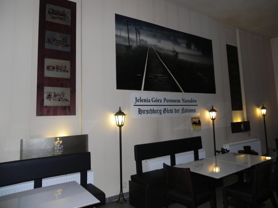 Czy istnieje jeszcze Peron Narodów? Jedna z sal zajmującego sporą kubaturę lokalu ma (miała wtedy – liczę na uaktualnienie mojego tekstu przez Czytelników) wystrój nietypowy. Znajdowały się tam prawdziwe tory, na ścianie tapeta stwarzała wrażenie, że nadjeżdża pociąg. Kilka starych porzuconych walizek, kilka przypadkowych przedmiotów. Czy porzucili je ci, którzy musieli opuścić swoje domy i jechać na Zachód, do Niemiec? Czy przywieźli je ci, którzy musieli opuścić swoje domy na Wschodzie i wyruszyli w drogę na Zachód? Jedni i drudzy zatrzymywali się na dworcu, na „Peronie Narodów”. Dla jednych był to Hirschberg im Riesengebirge, dla innych Jelenia Góra. Do mnie ta dekoracja przemówiła bardzo mocno.