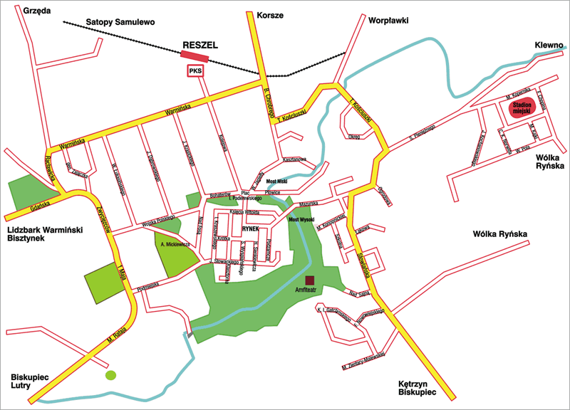 Z kościelnej wieży widać nie tylko regularną zabudowę uliczek centrum wokół Rynku, ale również dalsze regiony miasta – aż po jego okolice. I zabytki, których brak najbardziej mnie zaskoczył, gdy na internetowych stronach miasta otworzyłem jego plan. Przecierałem oczy szukając tego, z czego Reszel słusznie jest najbardziej dumny: zabytkowego zamku (o nim piszę w osobnym artykule), fary, późnobarokowego kościoła p.w. Podwyższenia św. Krzyża – obecnie greckokatolickiej cerkwi Przemienienia Pańskiego, a także również ponad 200-letniego ratusza. Trudno zrozumieć czym kierowali się włodarze miasteczka pomijając na jego oficjalnym planie te zabytki. Uwzględnili, poza ulicami, tylko rynek, amfiteatr, stadion miejski, przystanek PKS oraz dwa gotyckie mosty: Wysoki i Niski. Zabytki, poza przystankiem autobusowym, ciekawe, ale przecież nie aż tak, jak przynajmniej dwa najważniejsze z pominiętych. One bowiem są tu niemal od początku istnienia Reszla będąc głównymi świadkami jego przeszłości. Miasta i siedziby gminy na Pojezierzu Mrągowskim w powiecie kętrzyńskim woj. warmińsko-mazurskiego. Położonego nad rzeczką Sajną, dopływem Gubra, który wpada do o wiele bardziej znanej Łyny.