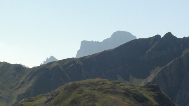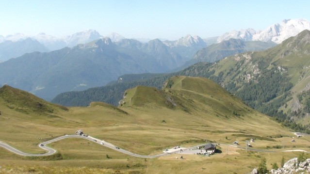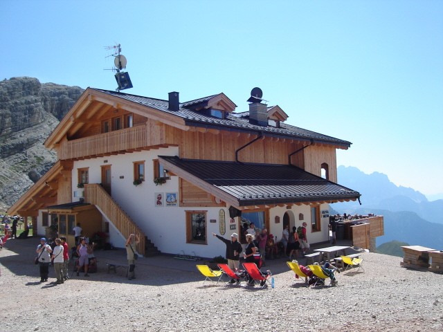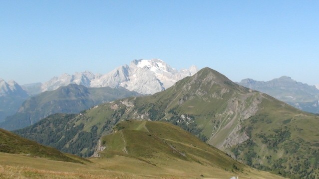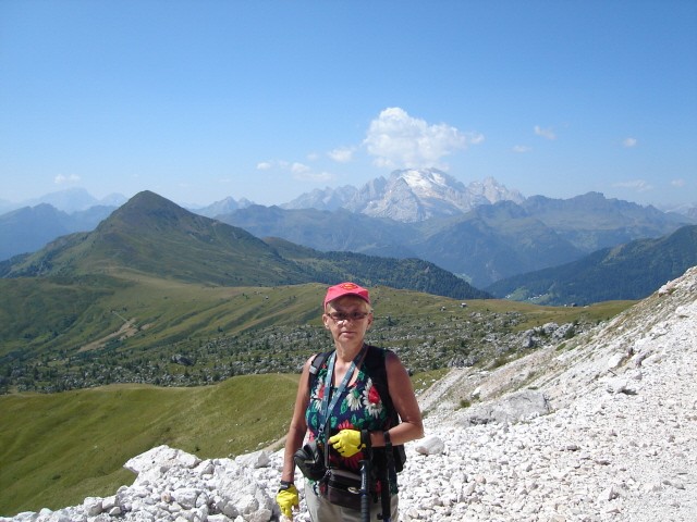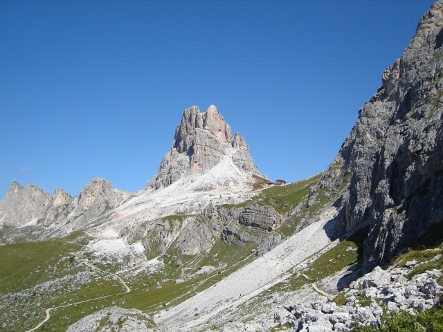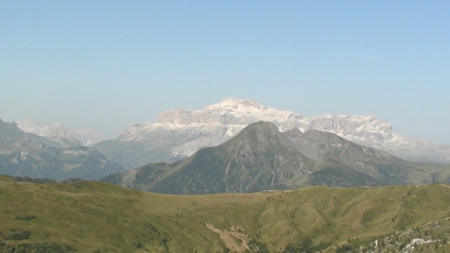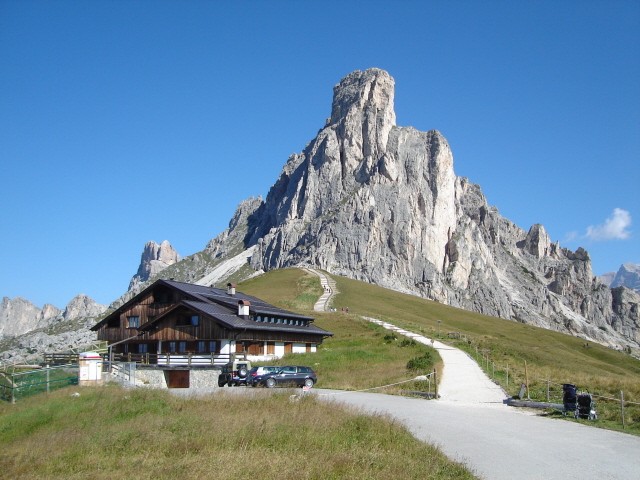 Od przełęczy wchodzimy na szeroką drogę oznakowaną numerem 452. Za drugim pensjonatem skręcamy w lewo na ścieżkę ?schodkową?. Nad głową wznosi się skalna baszta Ra Gusela (2595 m n.p.m.), tak fantastycznie prezentująca się z przełęczy. Idziemy teraz wśród głazów skalnych. Ścieżka się wije to w lewo, to w prawo. Po wyjściu z tych zakamarków, zobaczymy długą ścieżkę trawersującą Nuvolau ( 2575 m n.p.m.). Nie jest ona zbyt szeroka i wiedzie po piargach, więc należy wzmóc czujność. Jest super. Po prawej stronie ściana skalna, a co jakiś czas wyłania się na grani, na skraju urwiska schronisko rif. Nuvolau. Aż się wierzyć nie chce, że coś tam może stać. Po lewej rozległe, zielone łąki, a nad nimi na horyzoncie kolejne grupy górskie, które już poznaliśmy. Na pierwszym planie charakterystyczna Marmolada, obok zielony Padon, za nim Sella, a z boku Pelmo i Civetta. Wszystko jak na dłoni.