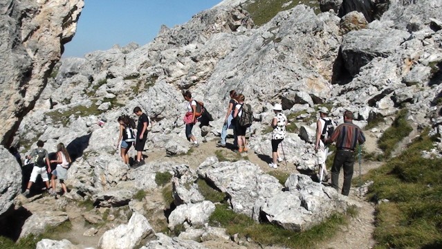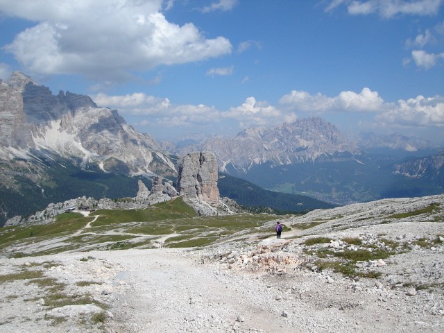 Do miejsc szczególnie zatłoczonych należy przełęcz Forcella Nuvolau. Turyści dochodzą tu z Passo Giau lub z Passo Falzarego, a większość wyjeżdża kolejką krzesełkową z Rif. Fedara znajdującego się poniżej przełęczy Forcella Nuvolau. My ruszamy z Passo Giau. Chcemy przejść szlak okrężny, wracając przez Becco Muraglia. Czas ?przewodnikowy? to około 6 godzin. Nijak to się ma do czasu realnego. Na przejście tej trasy trzeba przeznaczyć cały dzień. Przecież nie chodzi o szybkie pokonanie kilometrów, a o przeżycia wizualno-emocjonalne, a tych tu nie brakuje. Ścieżki wprawdzie są bardzo dobrze utrzymane, lecz kamieniste lub piarżyste, więc i uwaga musi być wzmożona, aby było bezpiecznie. Do tego należy dołożyć możliwości fizyczne i sumując wszystko razem, mamy niemal cały dzień wędrówki z odpoczynkami. Ale warto i gorąco polecam tą grupę górską i wybranie tego właśnie kierunku wędrówki. W przeciwną stronę jest o wiele trudniej.